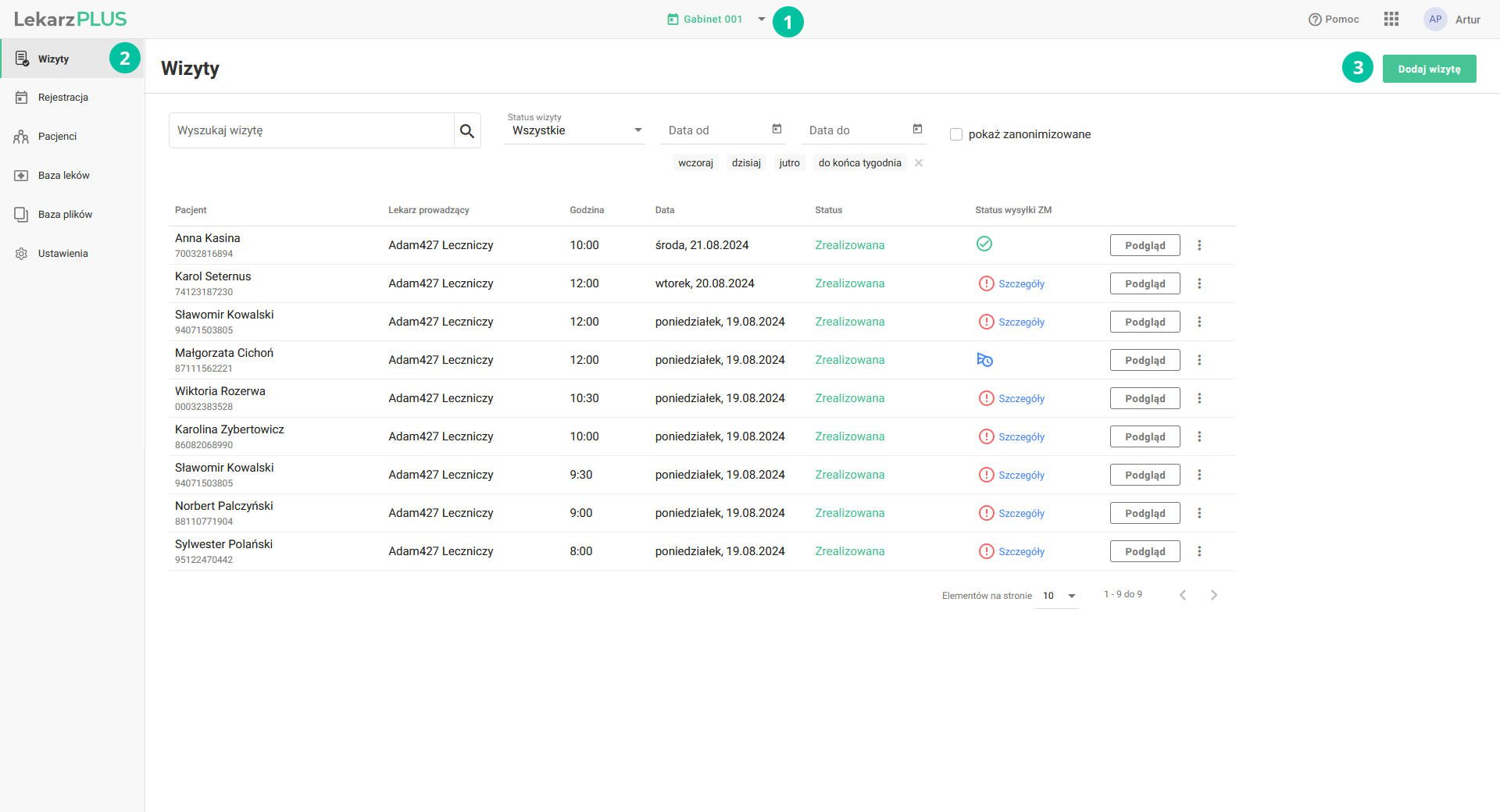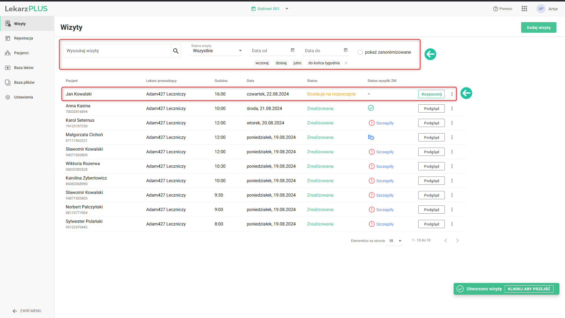 Wizyta zostaje zapisana i pojawia się na liście wizyt. Pamiętaj, że widoczność listy wizyt jest ograniczona, więc jeśli twoja wizyta nie jest widoczna, bo wybiega w przyszłość, to użyj filtrów w module, aby ją odnaleźć.