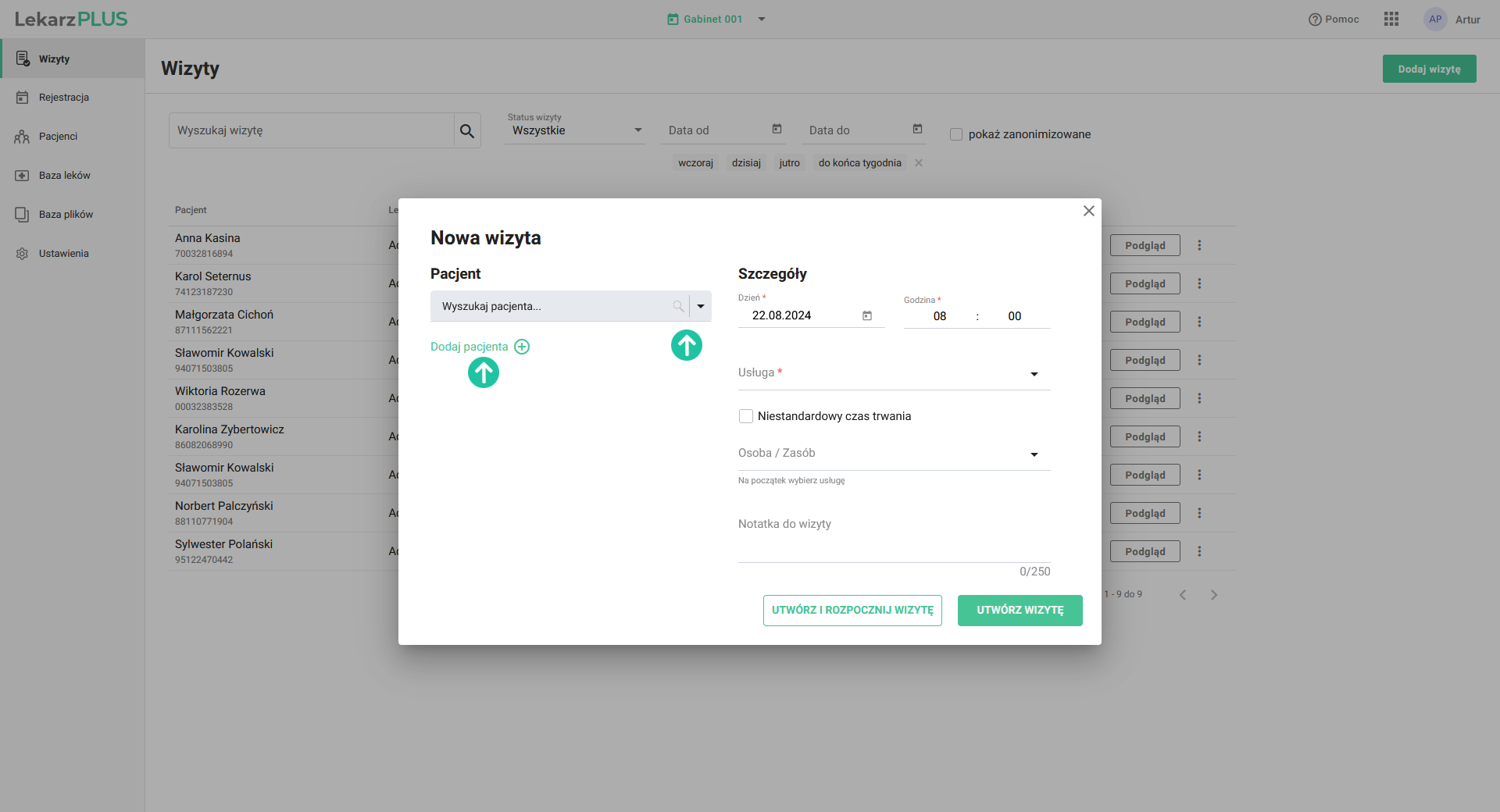W pierwszej kolejności wybierz gabinet z powiązanym terminarzem. Teraz w module Wizyty kliknij w przycisk Dodaj wizytę. Pojawi się okno nowej wizyty.