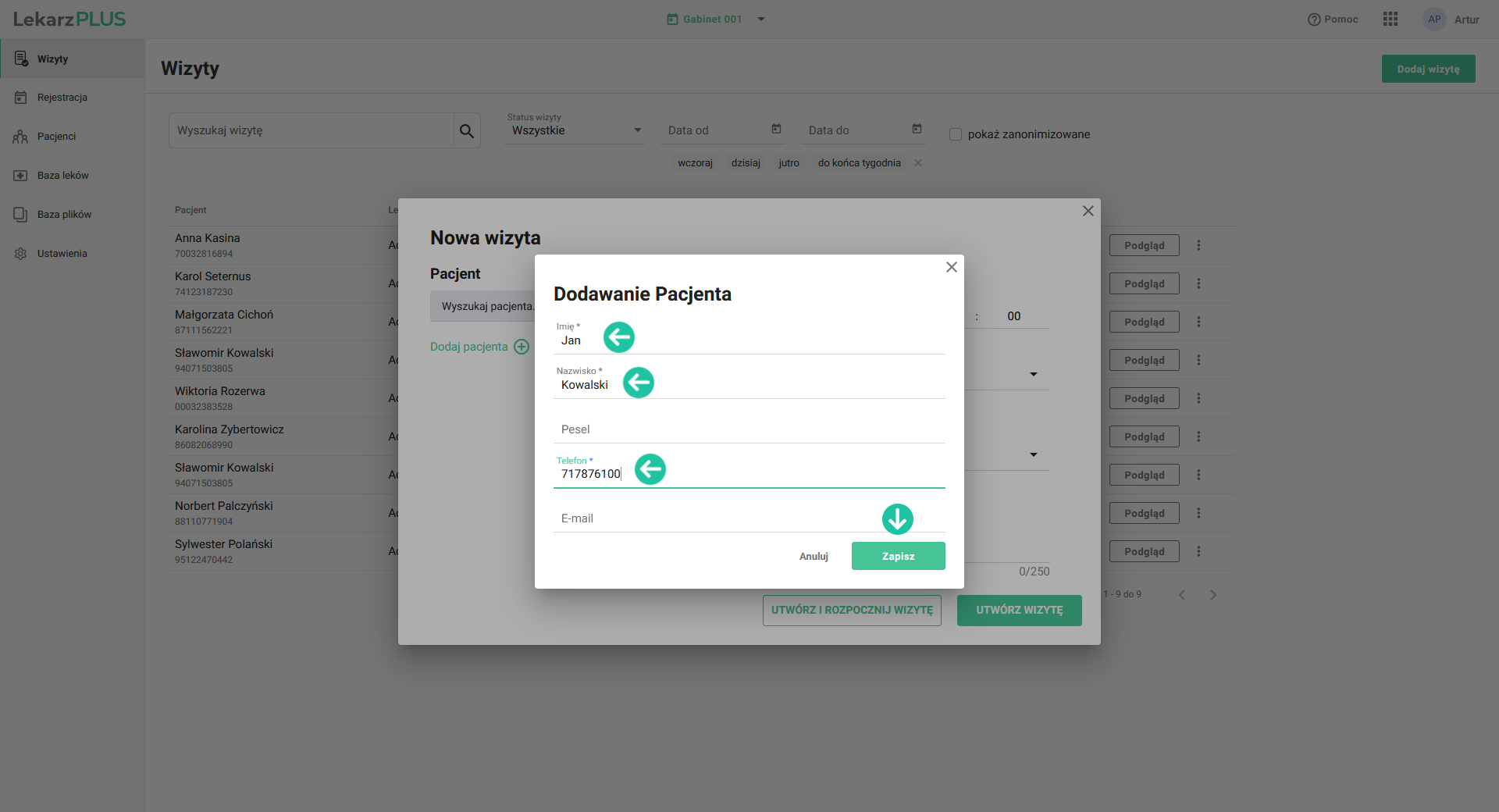 Aby zapisać dane pacjenta musisz podać przynajmniej: Imię; Nazwisko oraz Telefon. Pozostałe pola są opcjonalne. Zapisz wprowadzone informacje. Spowoduje to zapisanie kartoteki pacjenta w module pacjenci i przypisanie jej do planowanej wizyty.