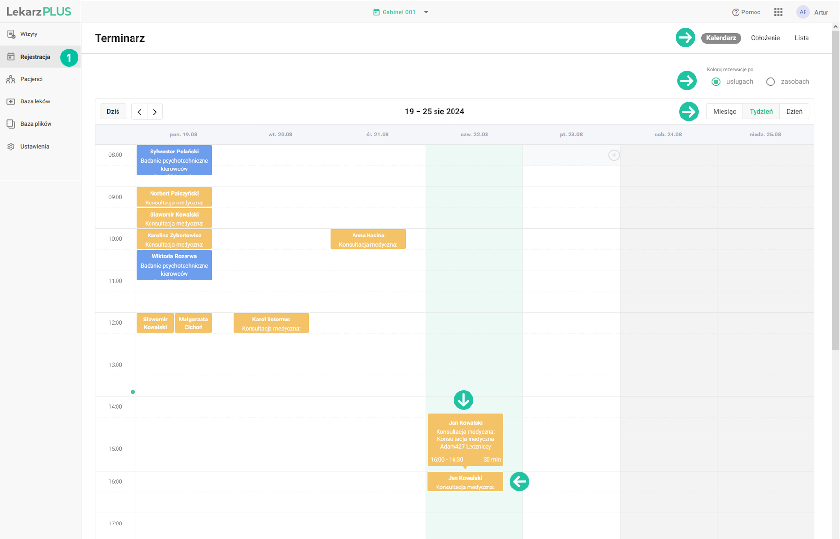 Wizyta widoczna jest także w module Rejestracja. Po najechaniu kursorem myszy, wyświetlane są szczegóły wizyty. Tutaj możesz sprawdzić wszystkie swoje wizyty, w postaci kalendarza. Szybko i prosto ocenisz obłożenie swojego dnia pracy. Użyj widoku dnia, tygodnia lub miesiąca, aby zmienić zakres dat. Z tego miejsca możesz też dodawać nowe wizyty, co zaprezentowane zostało w kolejnym kroku.