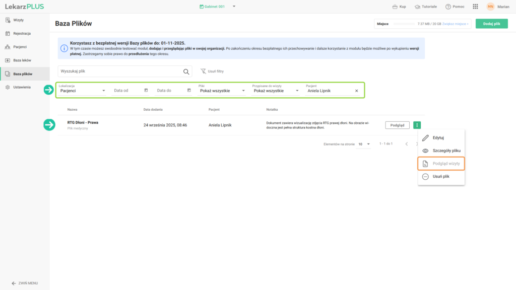 Po zatwierdzeniu dokument zostanie dodany do bazy. Pliki pacjenta odnajdziesz ustawiając odpowiednio filtry.