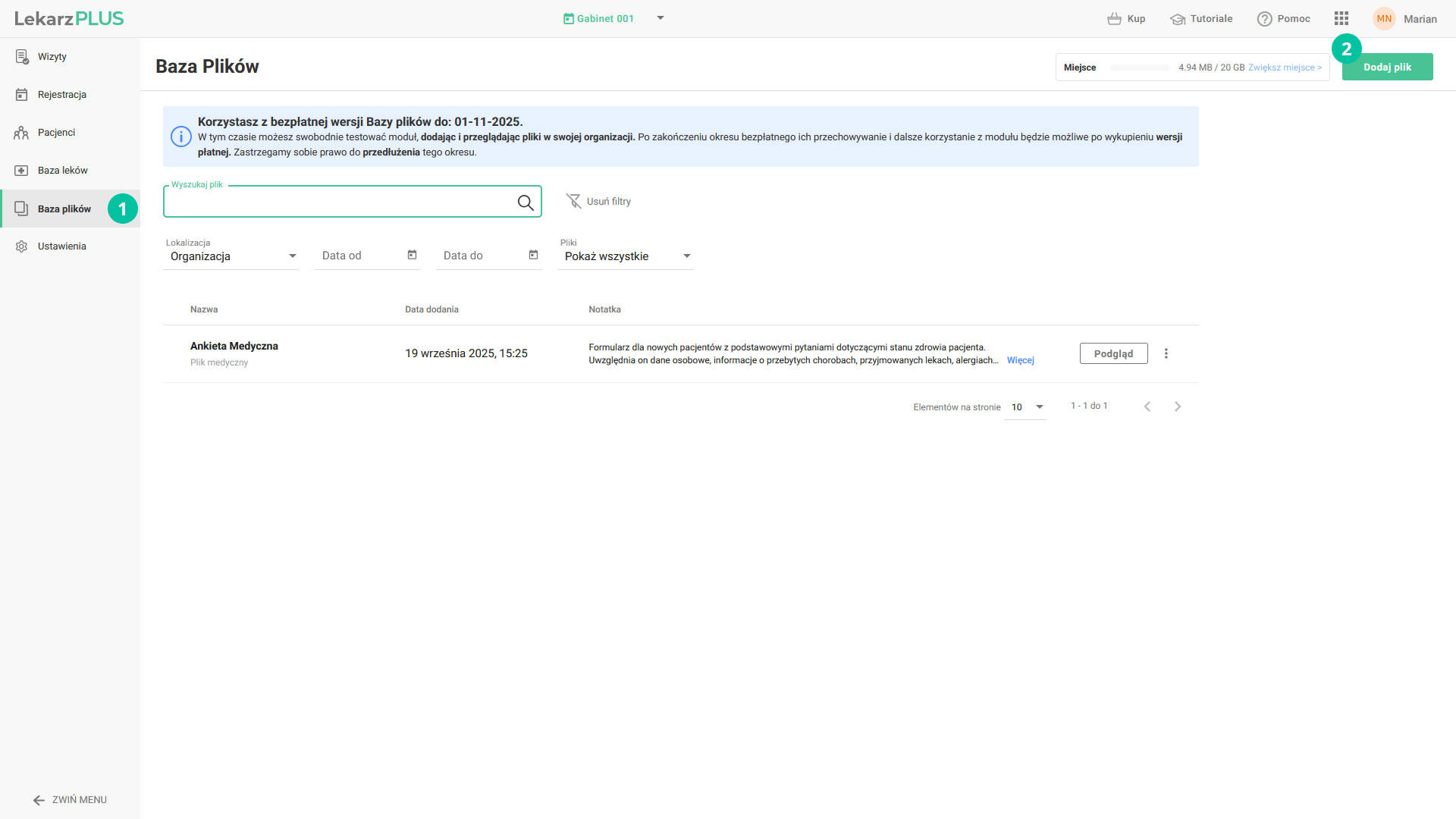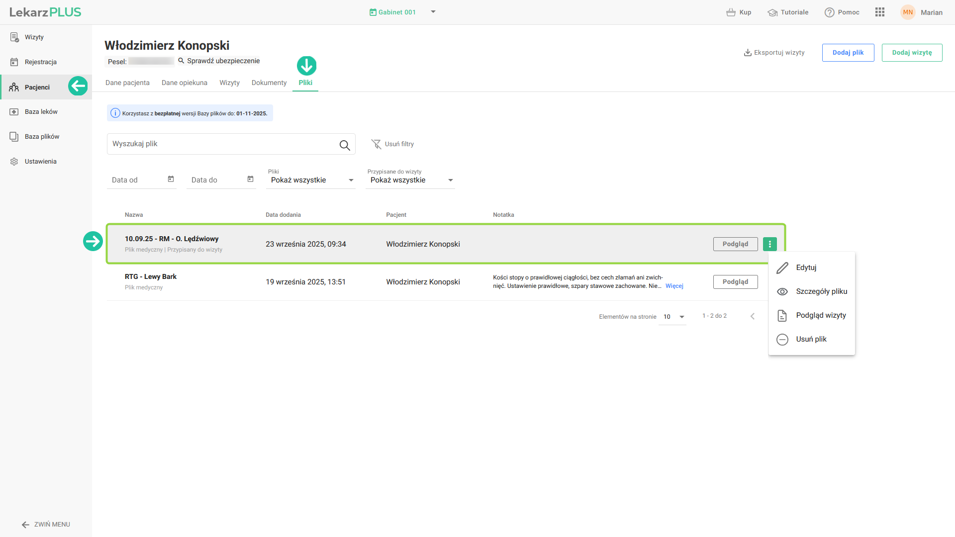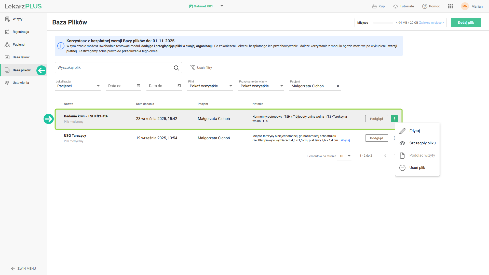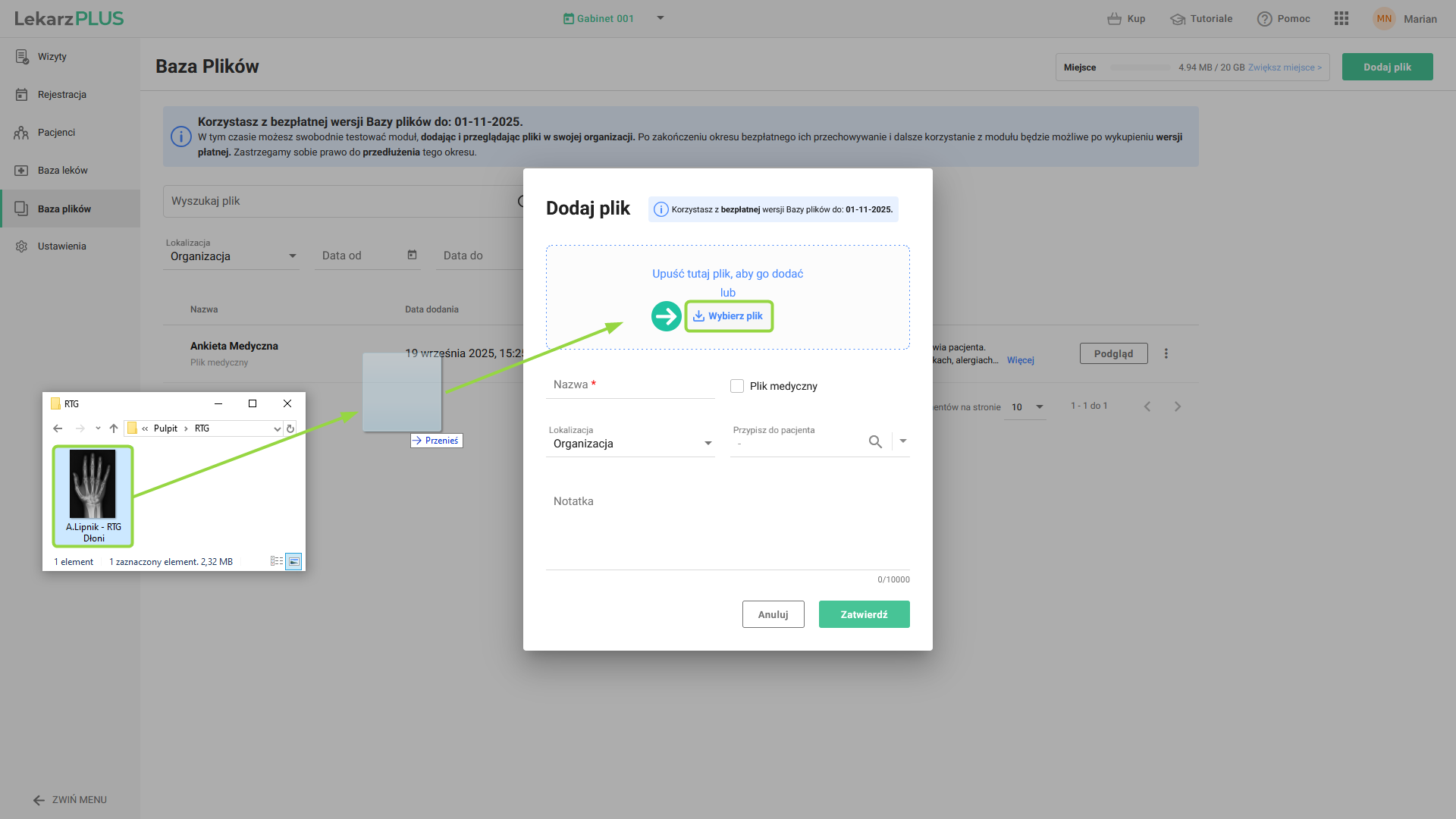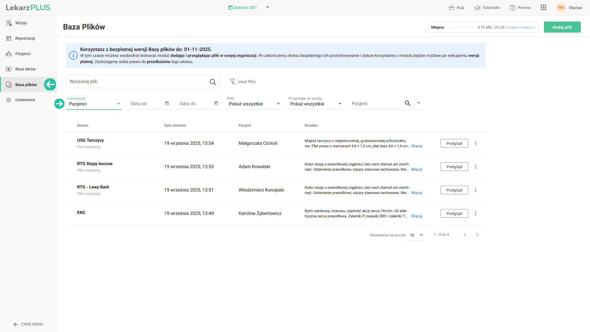 Niezależnie od tego, gdzie zostaną dodane, wszystkie dokumenty trafiają do modułu Baza Plików. Dzięki temu masz pewność, że cała dokumentacja pacjenta jest zebrana w jednym miejscu i zawsze pod ręką.