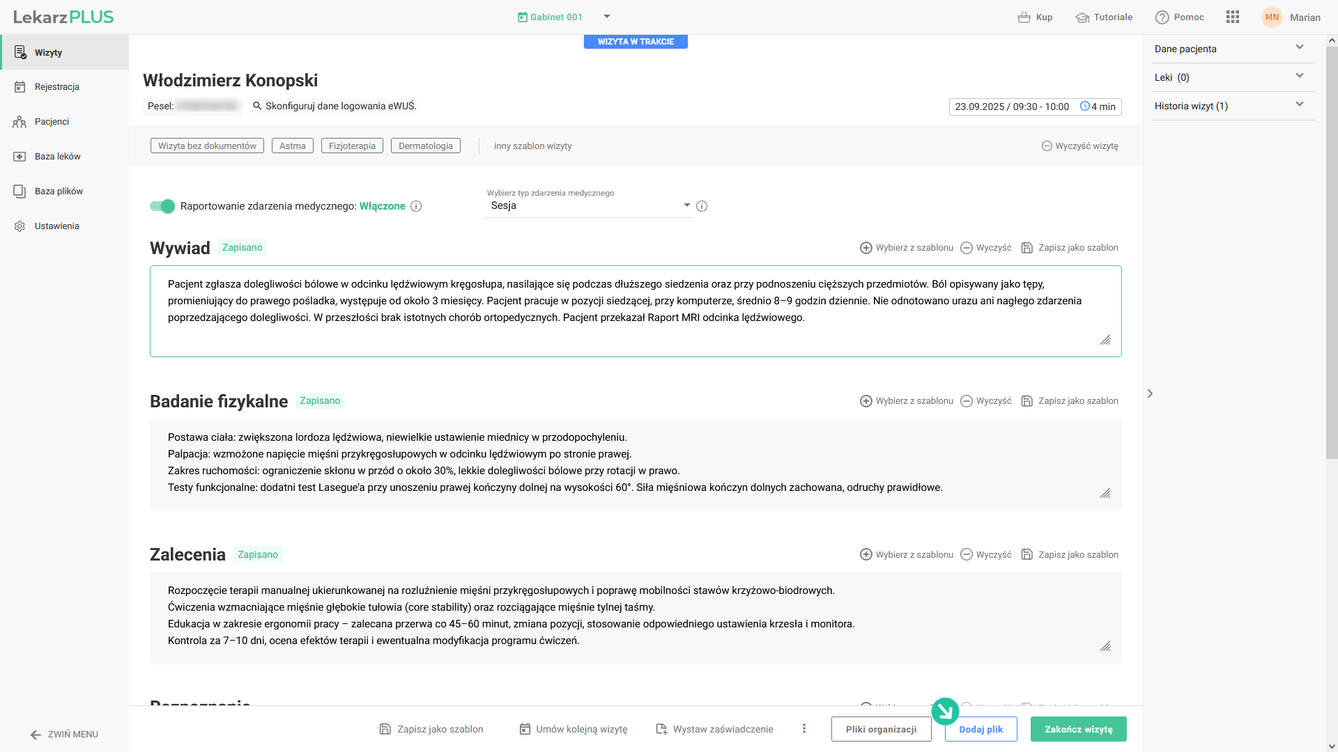 Po zapisaniu dokument zostaje przypisany zarówno do pacjenta, jak i do bieżącej wizyty. W module Pacjenci, w zakładce pliki widoczne są także dokumenty z poprzednich wizyt pacjenta, które możesz podejrzeć, pobrać, edytować lub usunąć.
