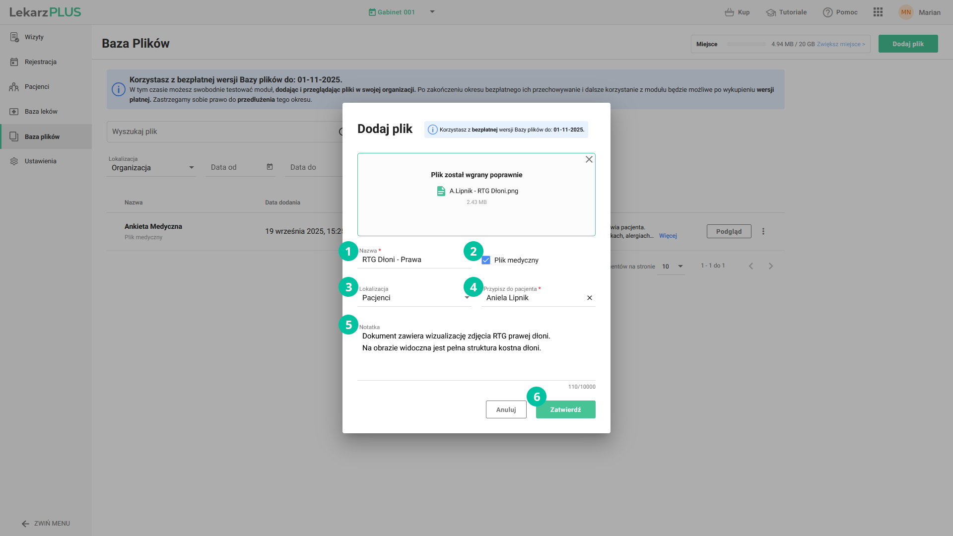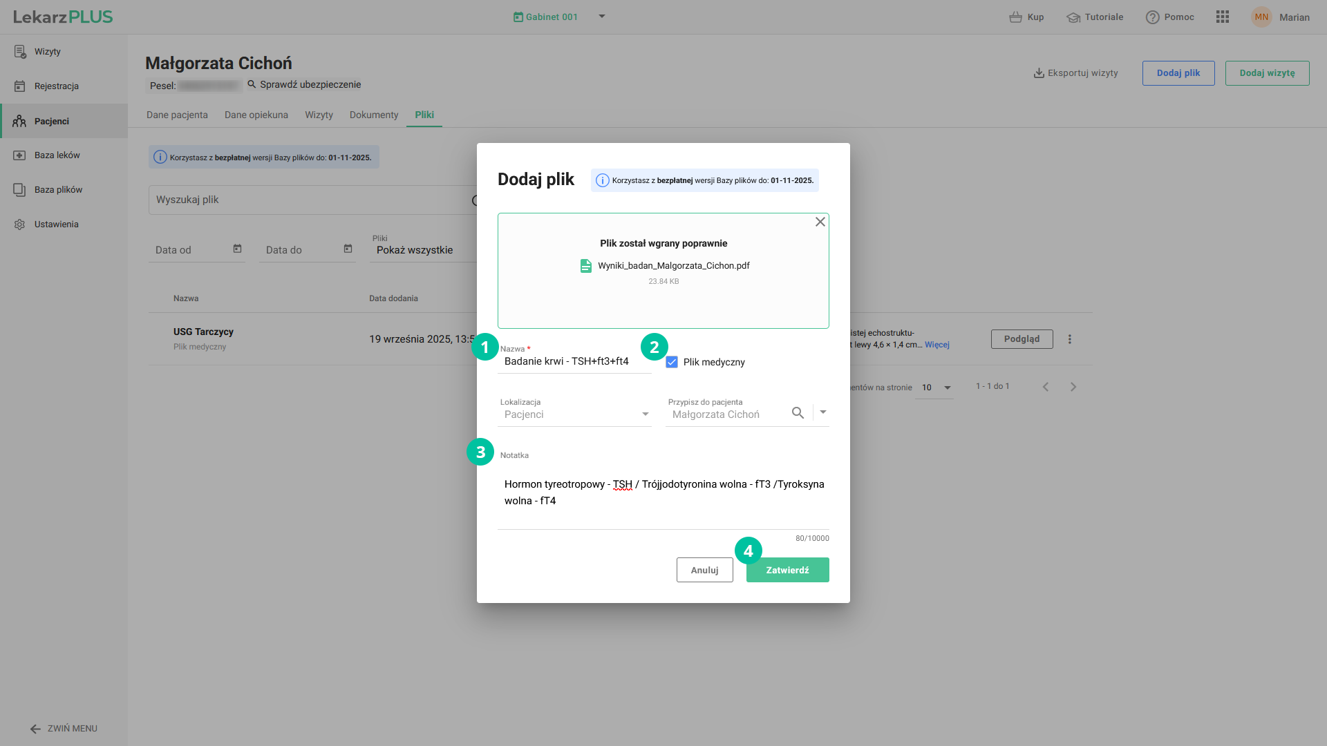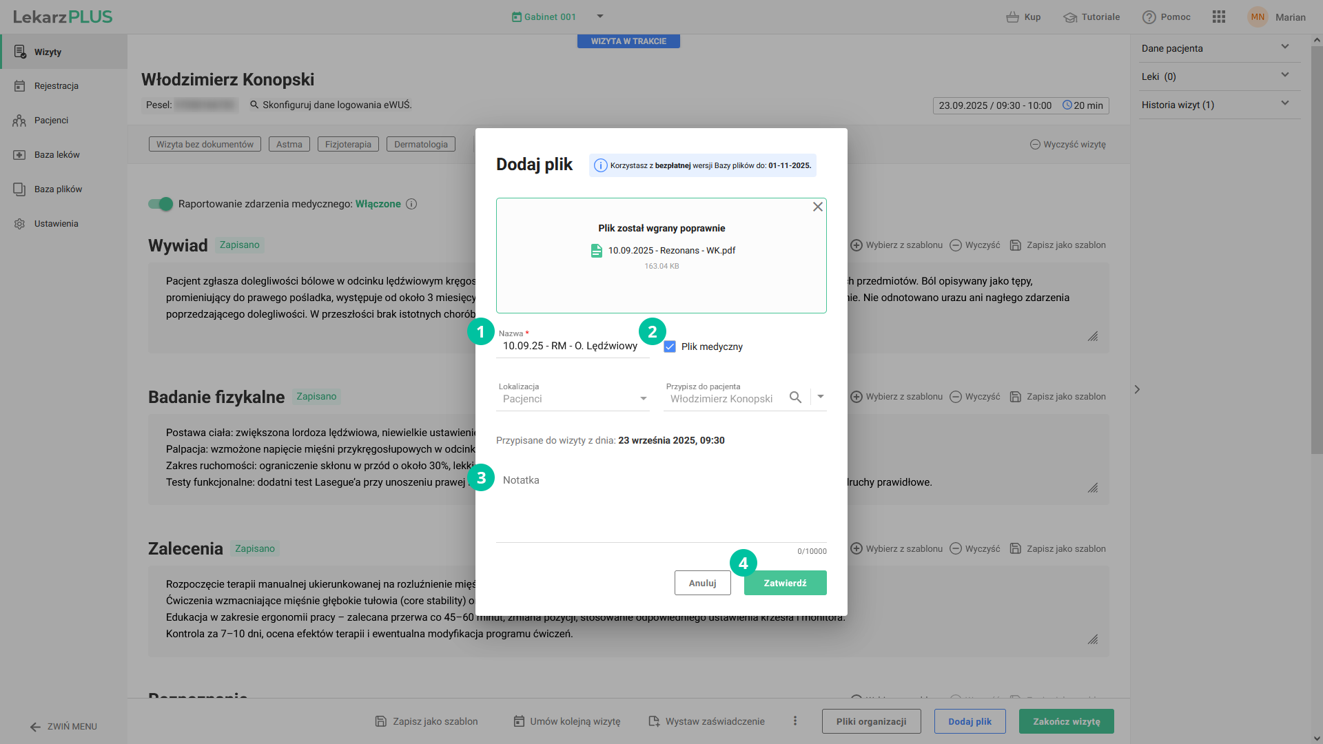 Po zatwierdzeniu dokument zostanie dodany do bazy. Pliki pacjenta odnajdziesz ustawiając odpowiednio filtry.