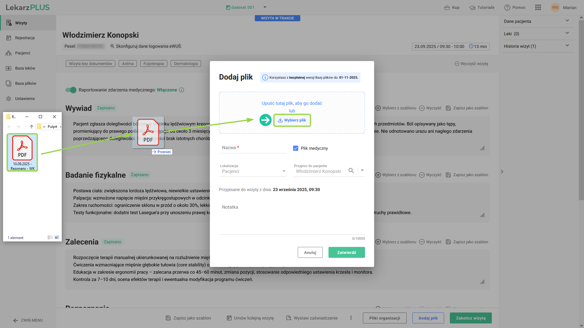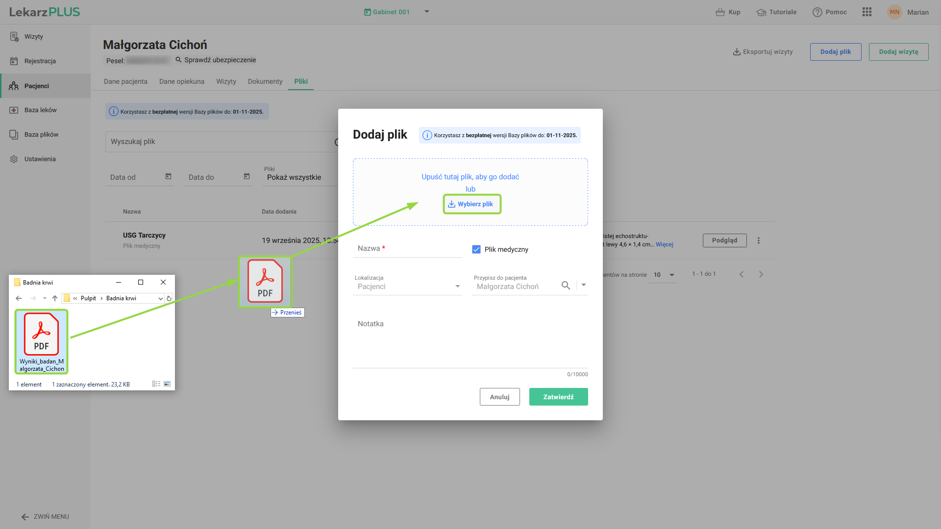 Pliki pacjenta można dodawać w kilku miejscach aplikacji: