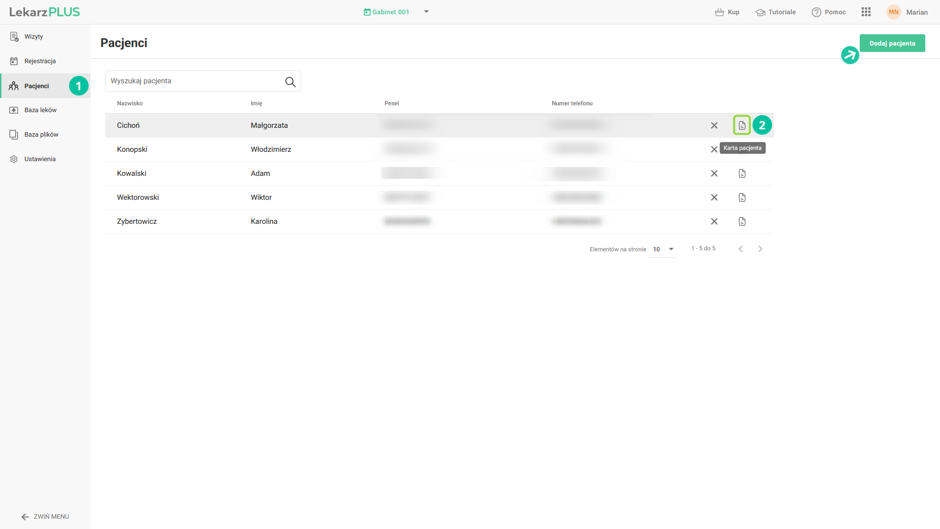 Przejdź do modułu Pacjenci i wybierz kartotekę danego pacjenta. Jeśli kartoteka pacjenta jeszcze nie istnieje, możesz skorzystać z opcji Dodaj pacjenta.