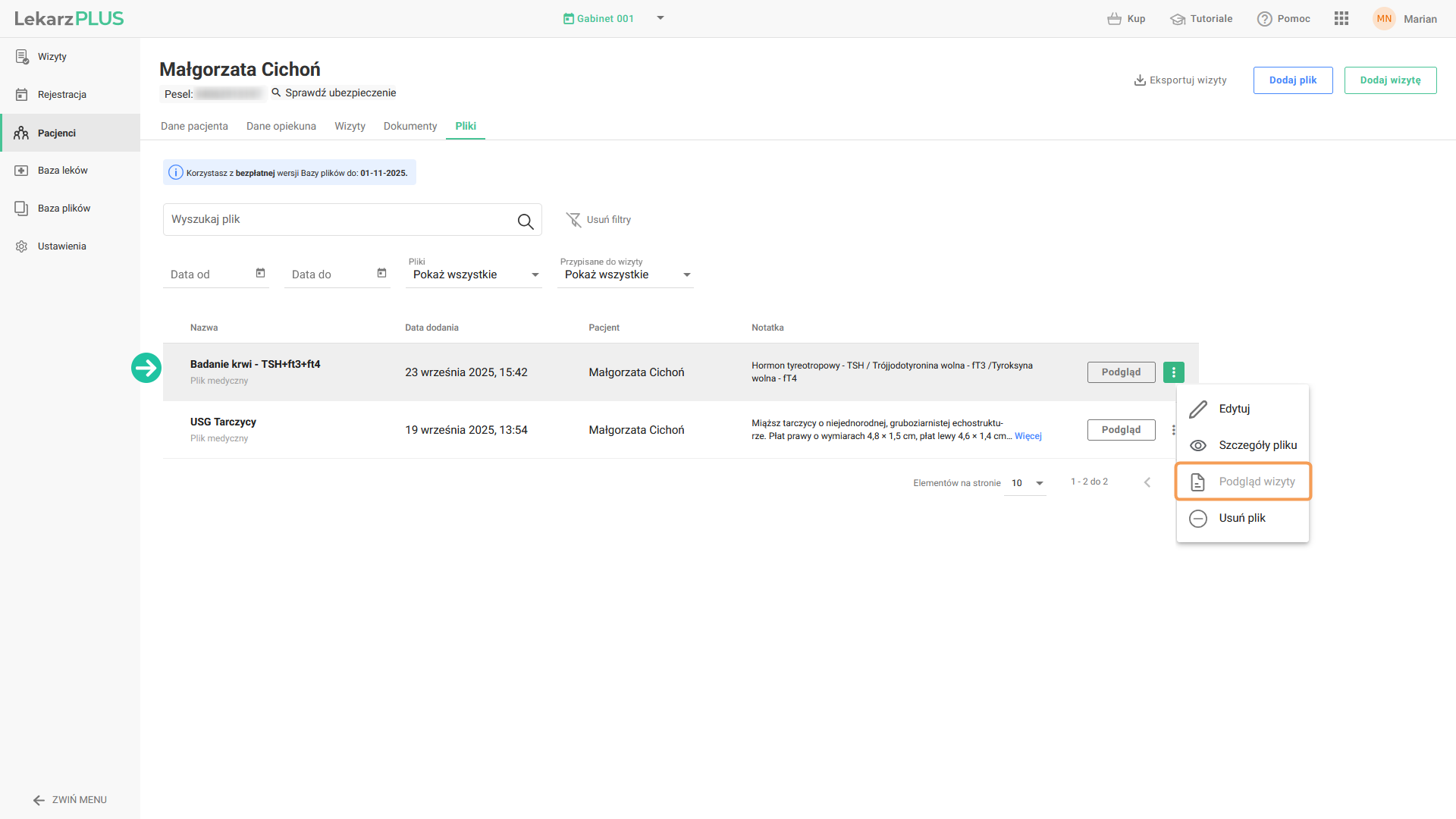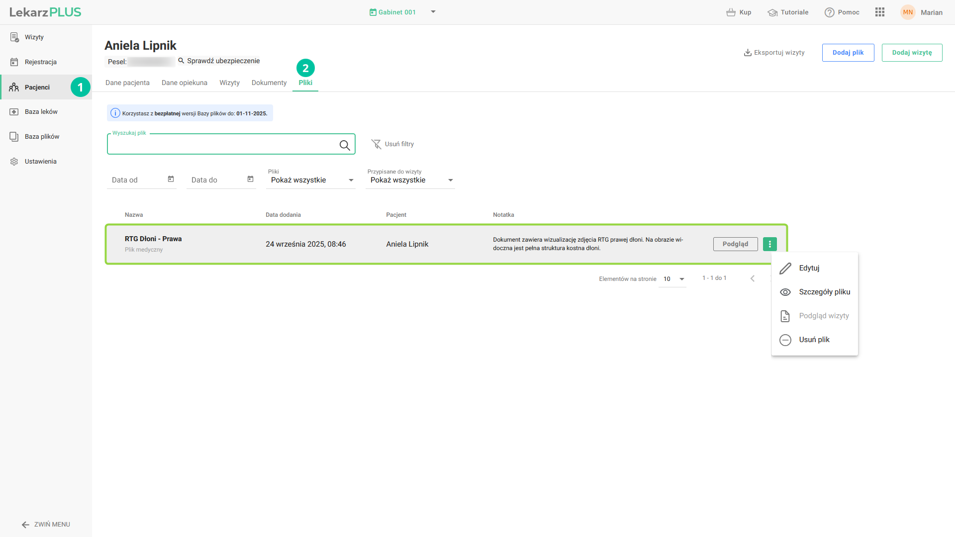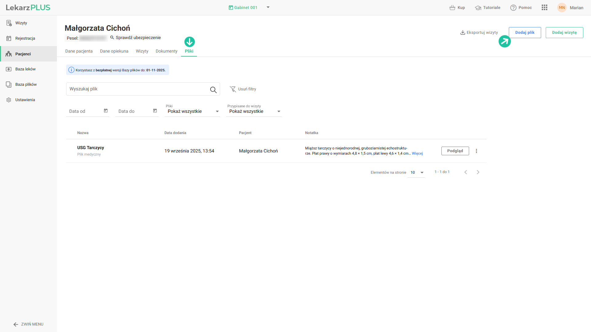 Dodany plik odnajdziesz również w module Pacjenci, w kartotece danego pacjenta, na zakładce Pliki.