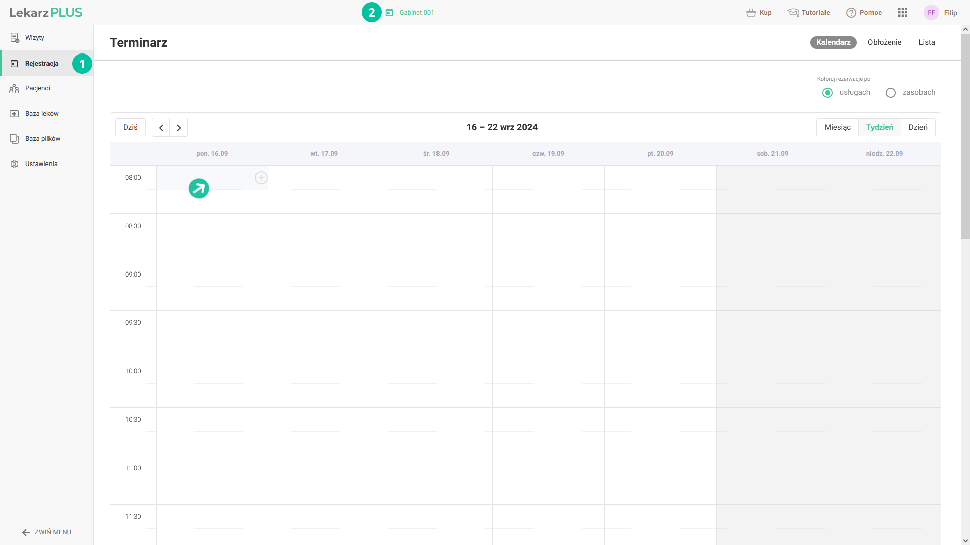 Proces rejestracji wizyty pacjenta rozpocznij od przejścia do modułu Rejestracja. Następnie wybierz odpowiedni gabinet (terminarz).