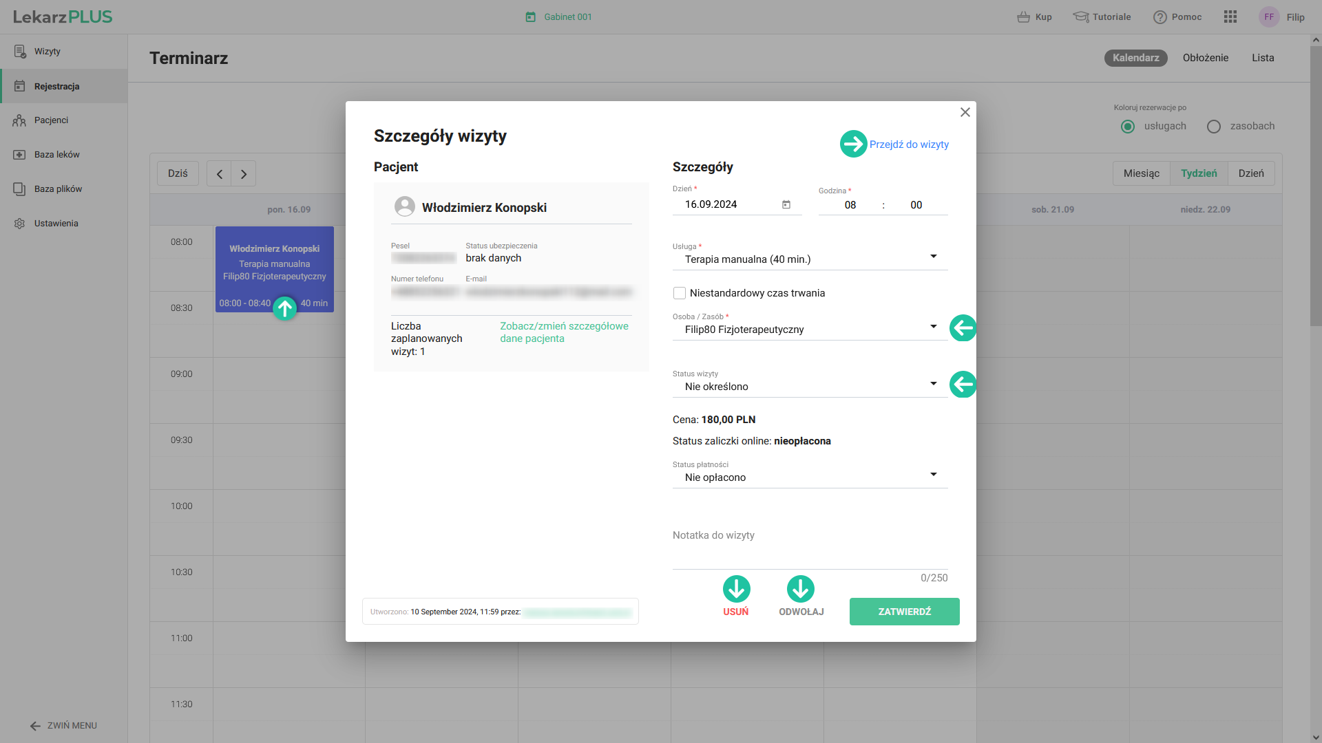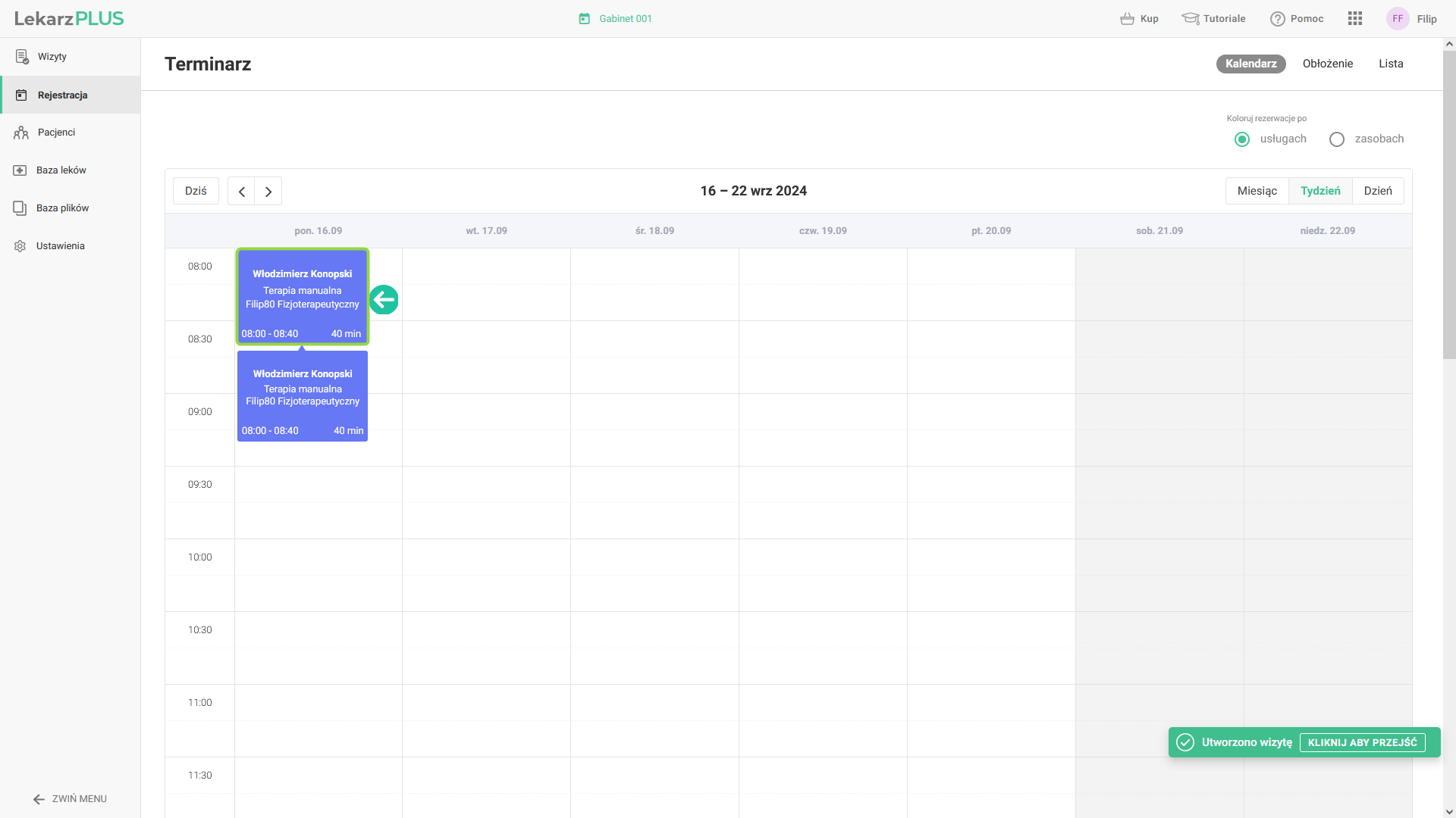 W przykładzie przedstawiamy rejestrację wizyty związanej z terapią manualną. Rezerwowany termin to 16.09.2024, godzina 8:00.