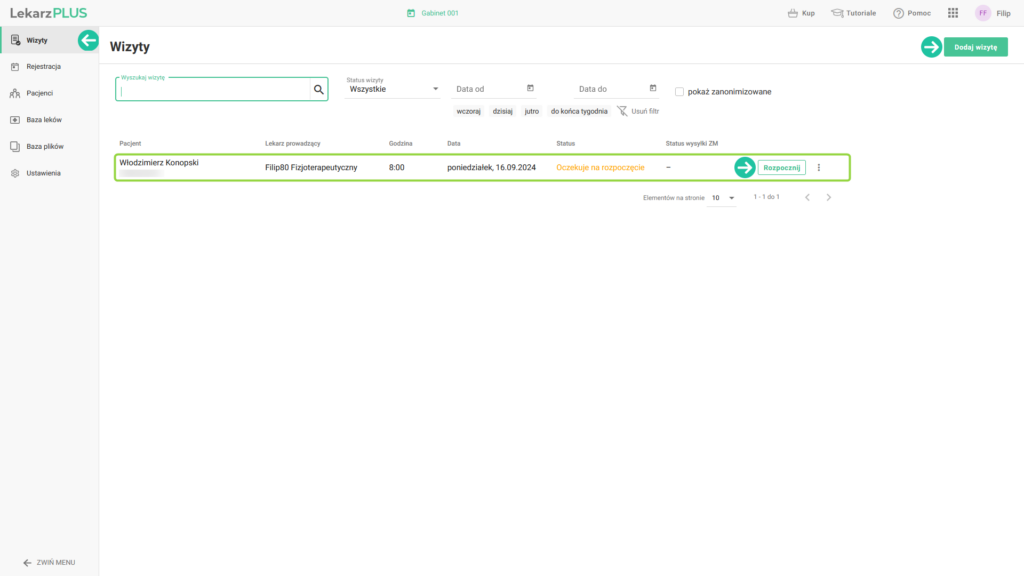 Możliwość planowania wizyt fizjoterapeutycznych dostępna jest również z poziomu modułu Wizyty. Jest to miejsce z którego poziomu zarówno rozpoczniesz i obsłużysz wizyty już zaplanowane jak i dodasz kolejne.