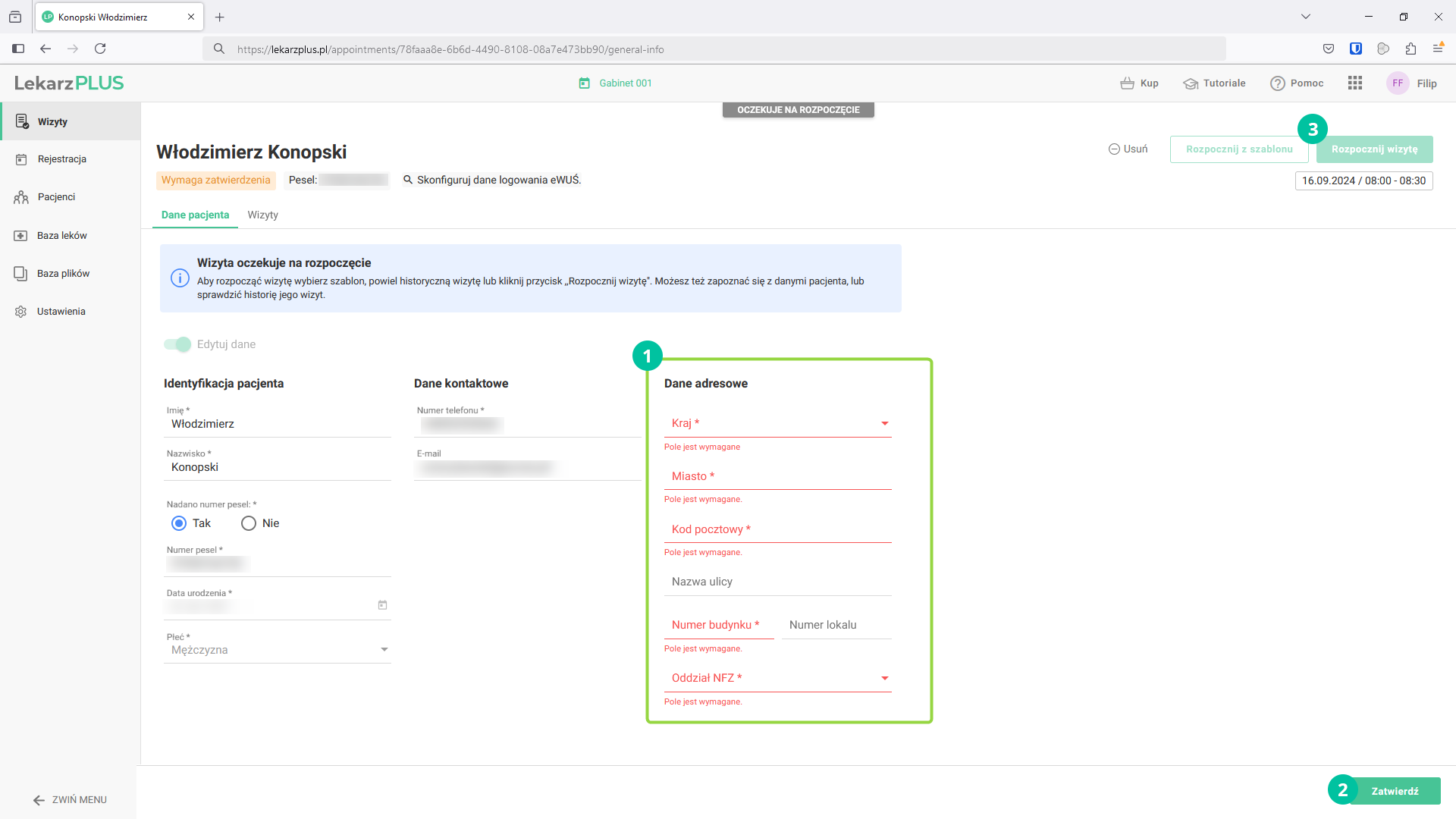 Uzupełnienie pozostałych danych niezbędnych do przeprowadzenia wizyty dostępna jest podczas próby rozpoczęcia wizyty. Jeśli dane pacjenta są niewystarczające, aplikacja wyświetli okno, w którym możliwe będzie uzupełnienie niezbędnych danych. Zatwierdzenie wprowadzonych danych odblokuje możliwość rozpoczęcia wizyty.