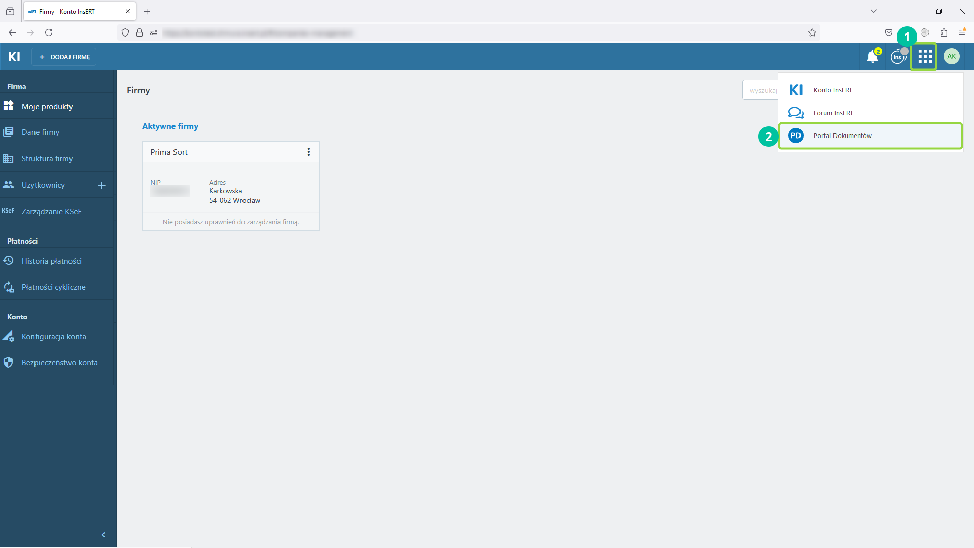 Po zalogowaniu wybierz menu aplikacji dostępne w prawym górnym rogu ekranu, a następnie wybierz Portal Dokumentów.