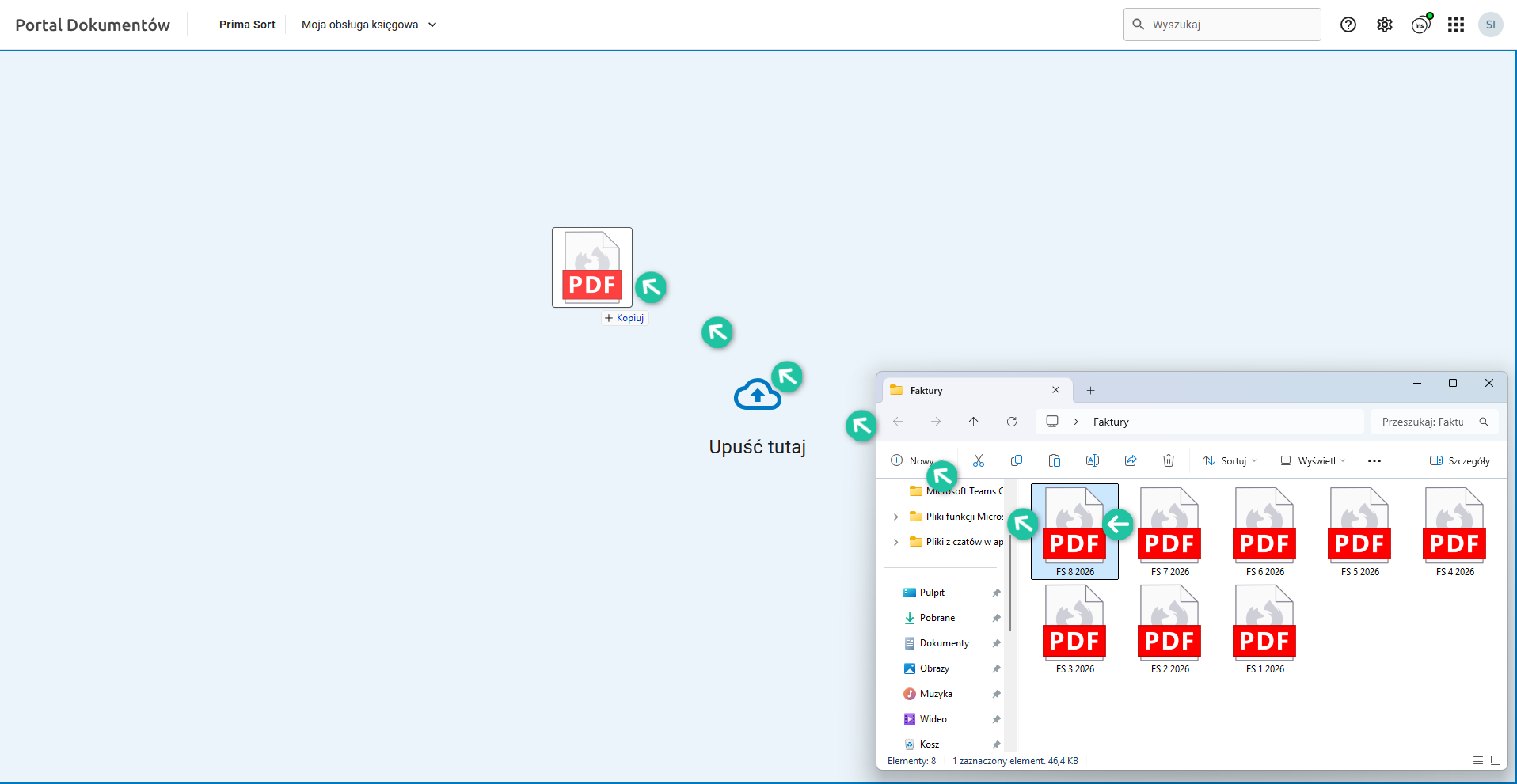 - Połącz w jeden dokument – opcja umożliwia połączenie przesyłanych plików w jeden dokument do zaksięgowania. Może być to przydatne w sytuacji, gdy wydruk dokumentu handlowego został rozbity na kilka plików, które należałoby scalić;