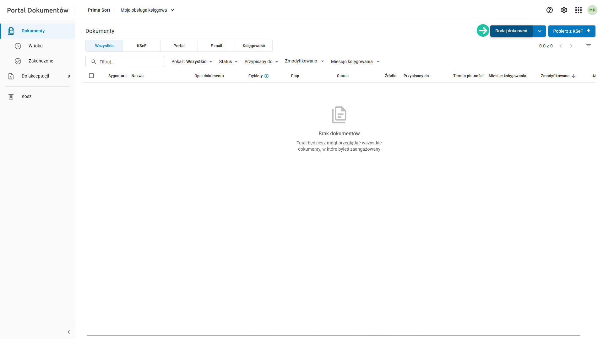 Właśnie zalogowałeś się do aplikacji Portal Dokumentów. W celu dodania dokumentu do Portalu wybierz przycisk Dodaj dokument. Możesz również skorzystać z metody przesłania dokumentów metodą przeciągnij i upuść.