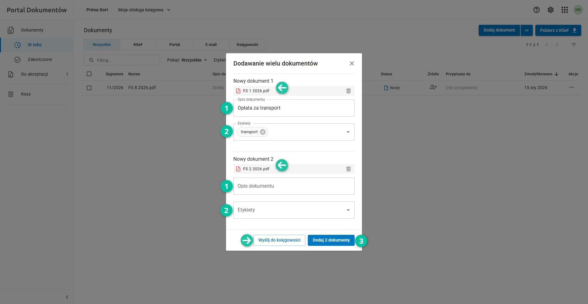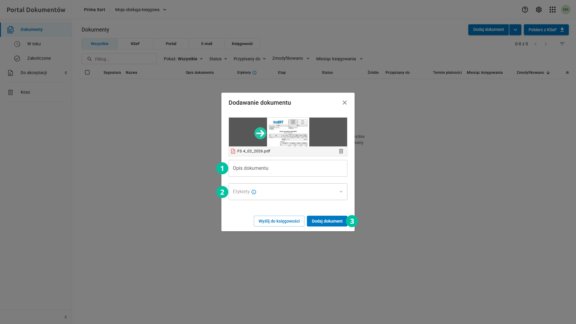 Aby zakończyć proces wysyłania dokumentu do Portalu, kliknij Dodaj dokument. Należy pamiętać, że w przypadku wyboru opcji Wyślij do księgowości dokument zostanie przesłany bezpośrednio do programu księgowego i nie będzie już możliwa jego edycja w portalu dokumentów.
