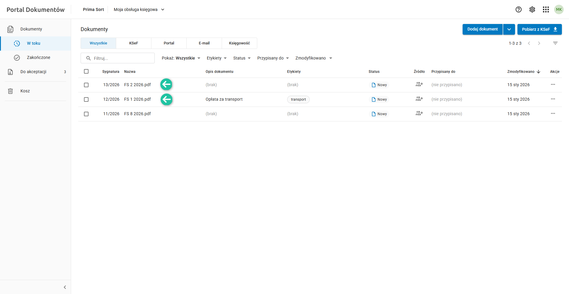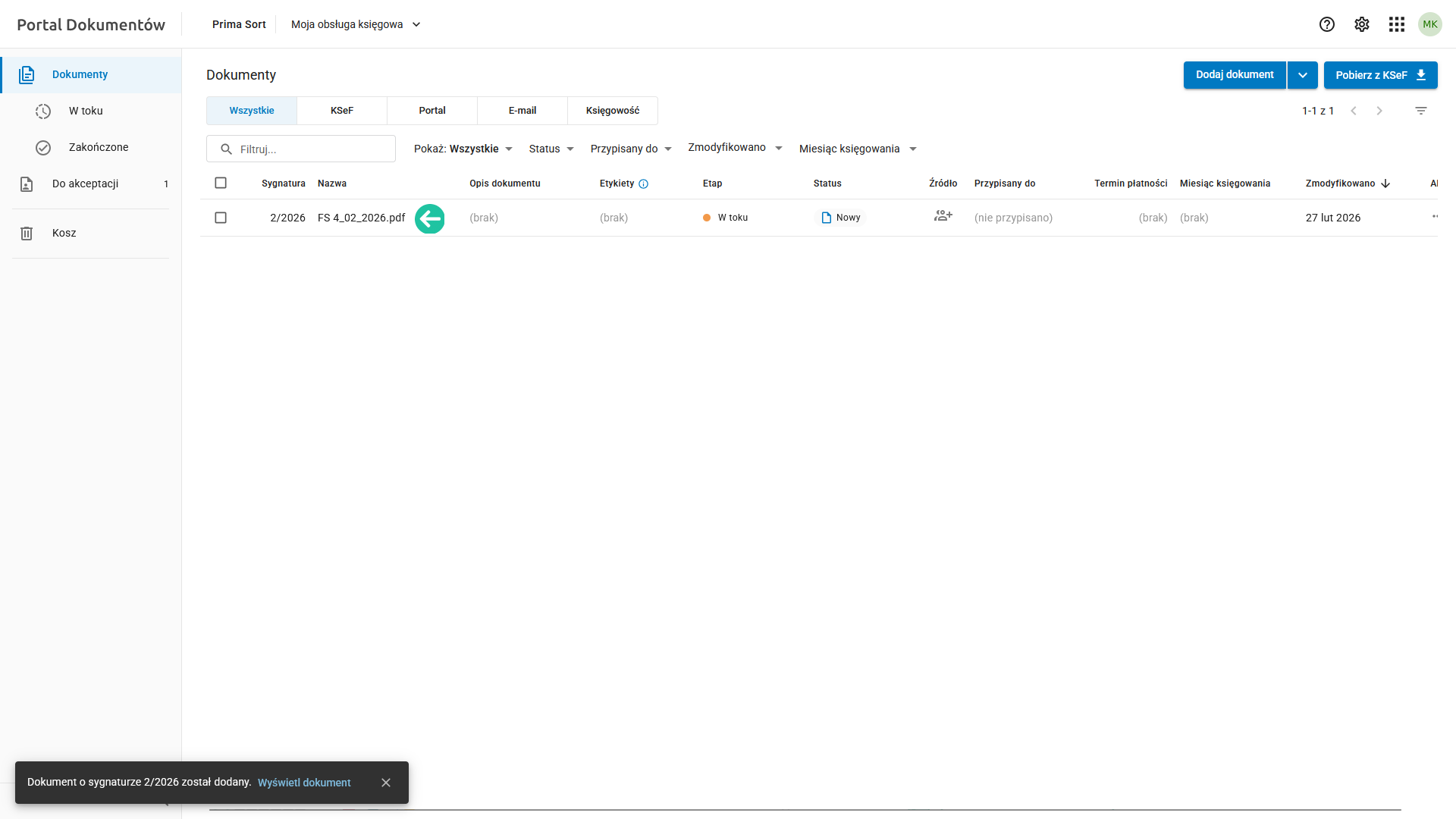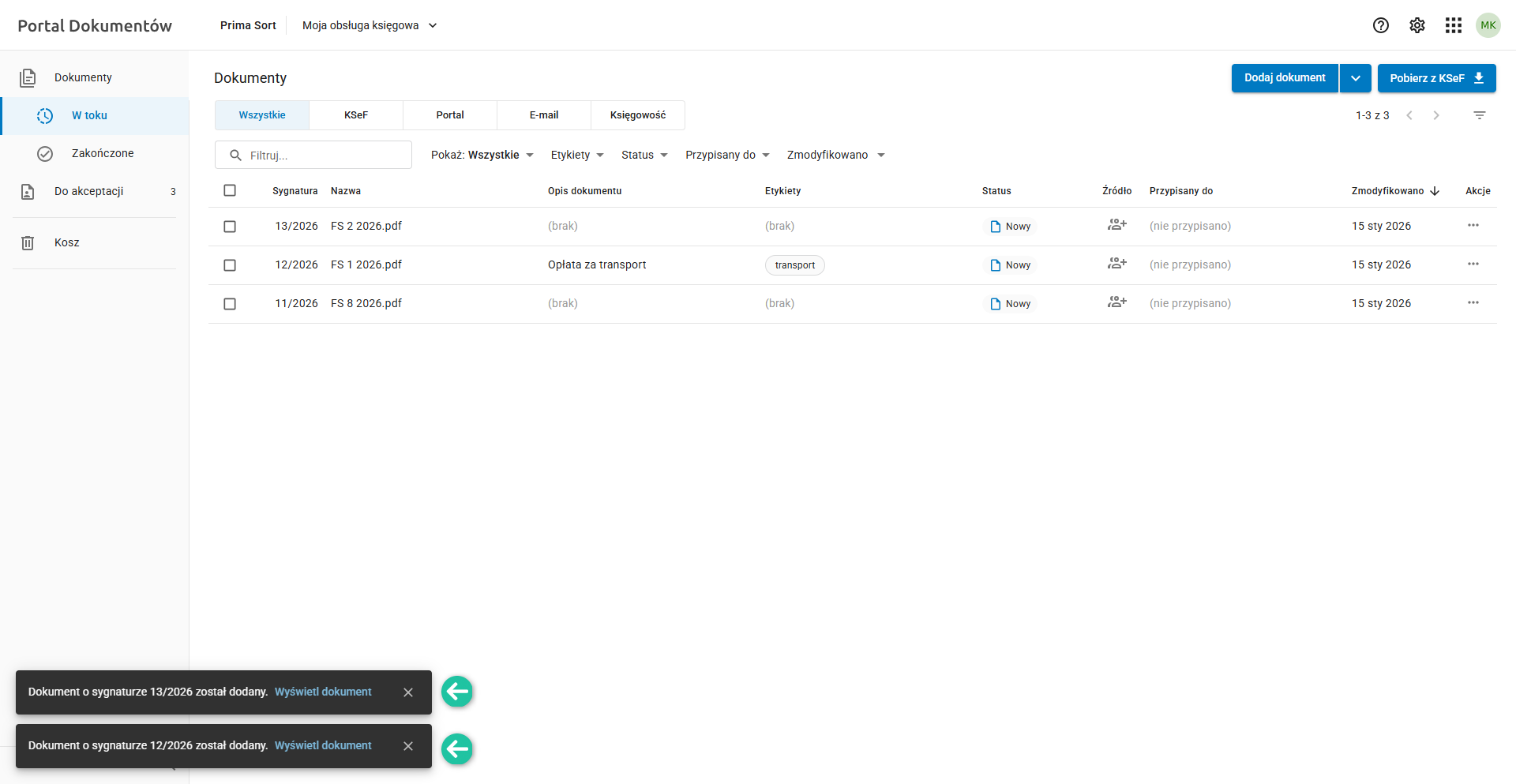 Przesłane dokumenty pojawią się na liście w menu W toku przy czym w sekcji Do akceptacji pojawiają się one tylko wtedy, gdy nie są do nikogo przypisane lub przypisano je do obecnie zalogowanego użytkownika.