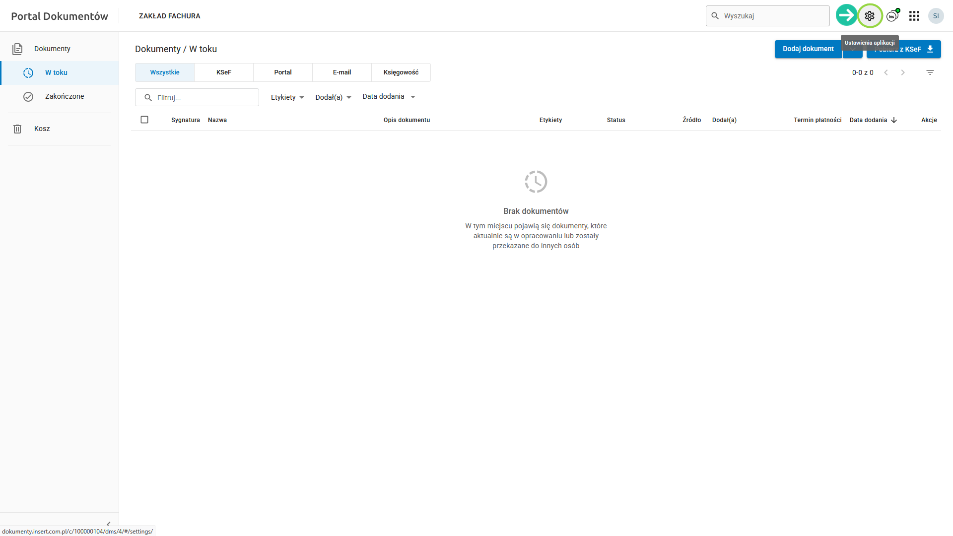 Aby skonfigurować wysyłkę dokumentów do Portalu Dokumentów z poziomu poczty elektronicznej, przejdź do Ustawień aplikacji klikając w ikonę koła zębatego w prawym górnym rogu ekranu.