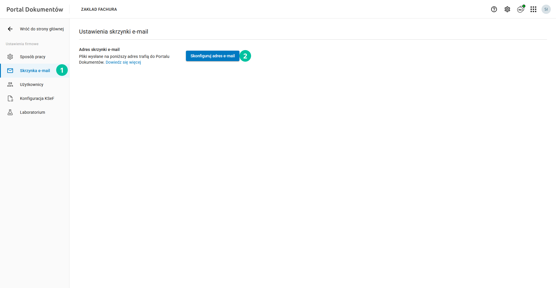 Uwaga! Pełną konfigurację może przeprowadzić wyłącznie administrator firmy (osoba posiadająca uprawnienia zarówno do Portalu Dokumentów jak i administratora globalnego firmy).