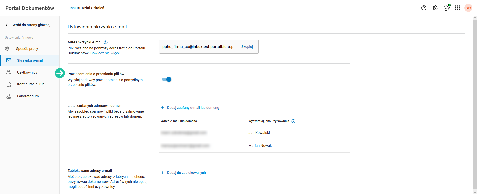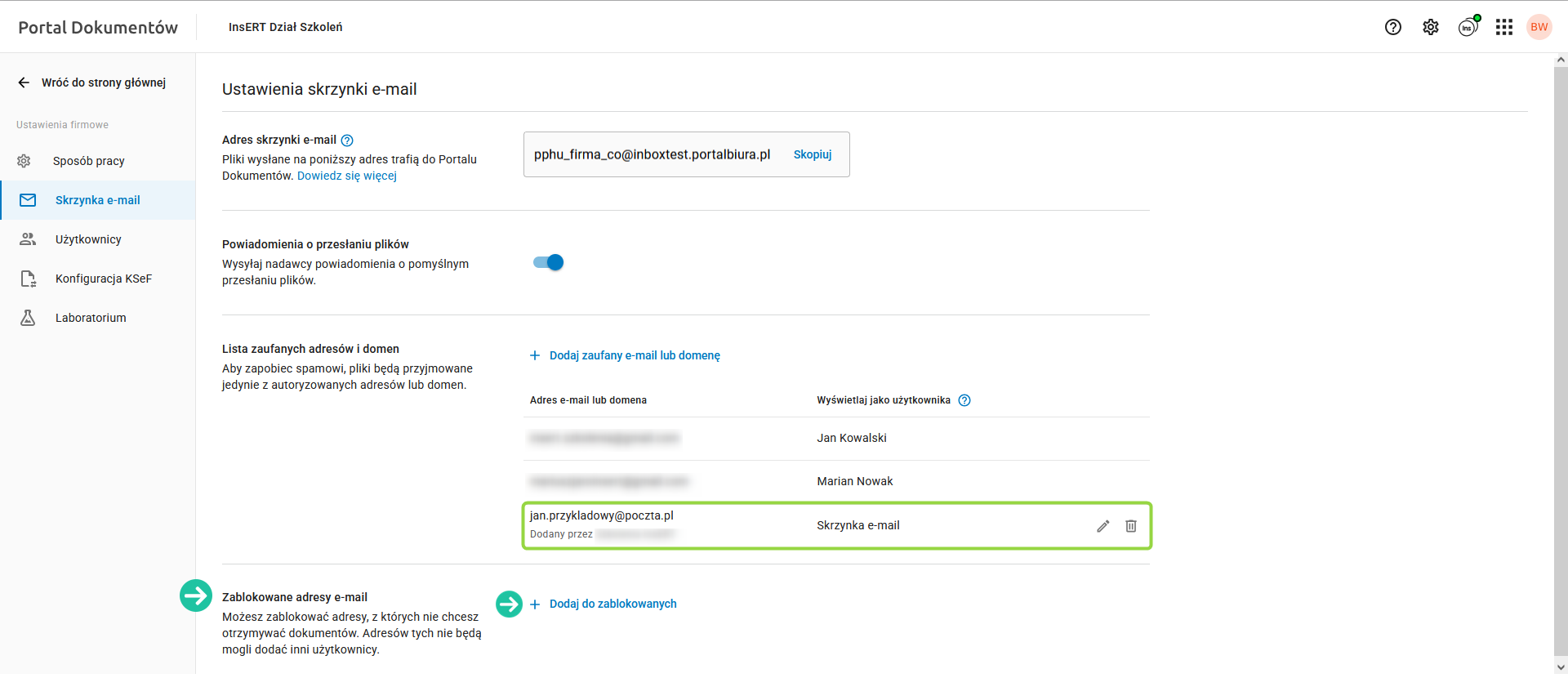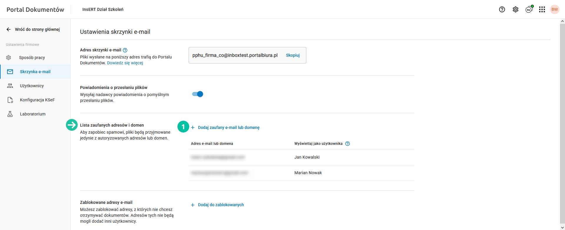 Poniżej znajduje się lista zaufanych adresów i domen. Określa ona adresy e-mail oraz domeny, z których można przesyłać dokumenty do Portalu Dokumentów. W standardzie lista zaufanych adresów może być uzupełniona o adresy e-mail użytkowników Konta InsERT, posiadających uprawnienia do Portalu Dokumentów.
