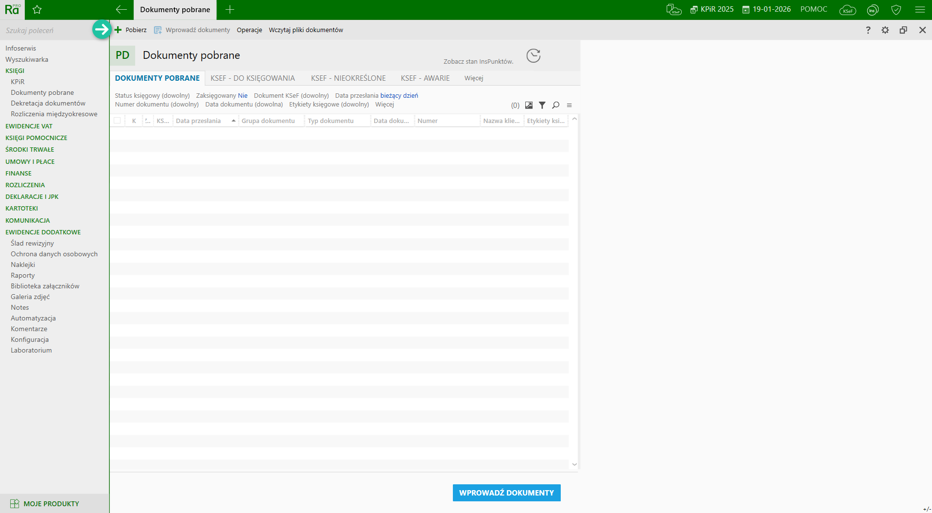 Warto zaznaczyć, że w przypadku aktywnego połączenia z Krajowym systemem e-Faktur (KSeF), pobierane są wszystkie dokumenty przesłane przez użytkowników Portalu (zdjęcia, pliki PDF) oraz e-Faktury pobrane z KSeF, które wcześniej pobrane zostały do Portalu dokumentów.