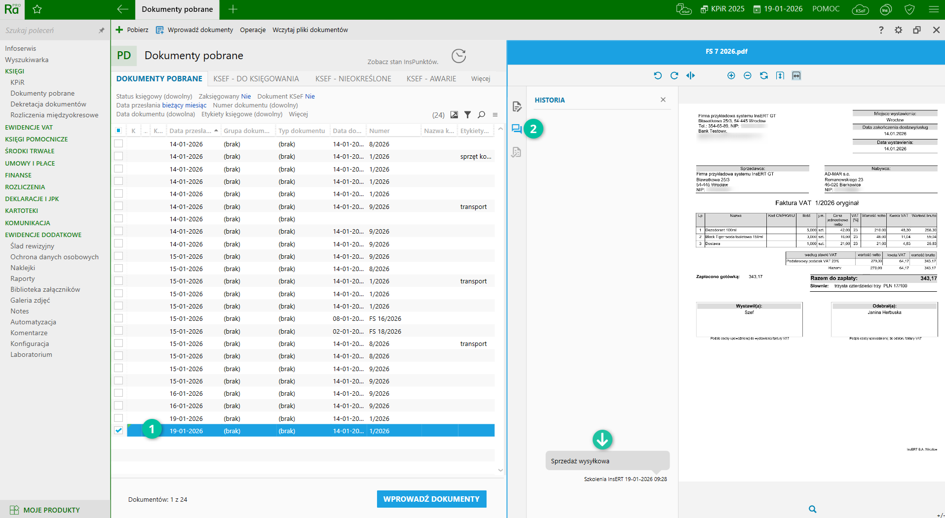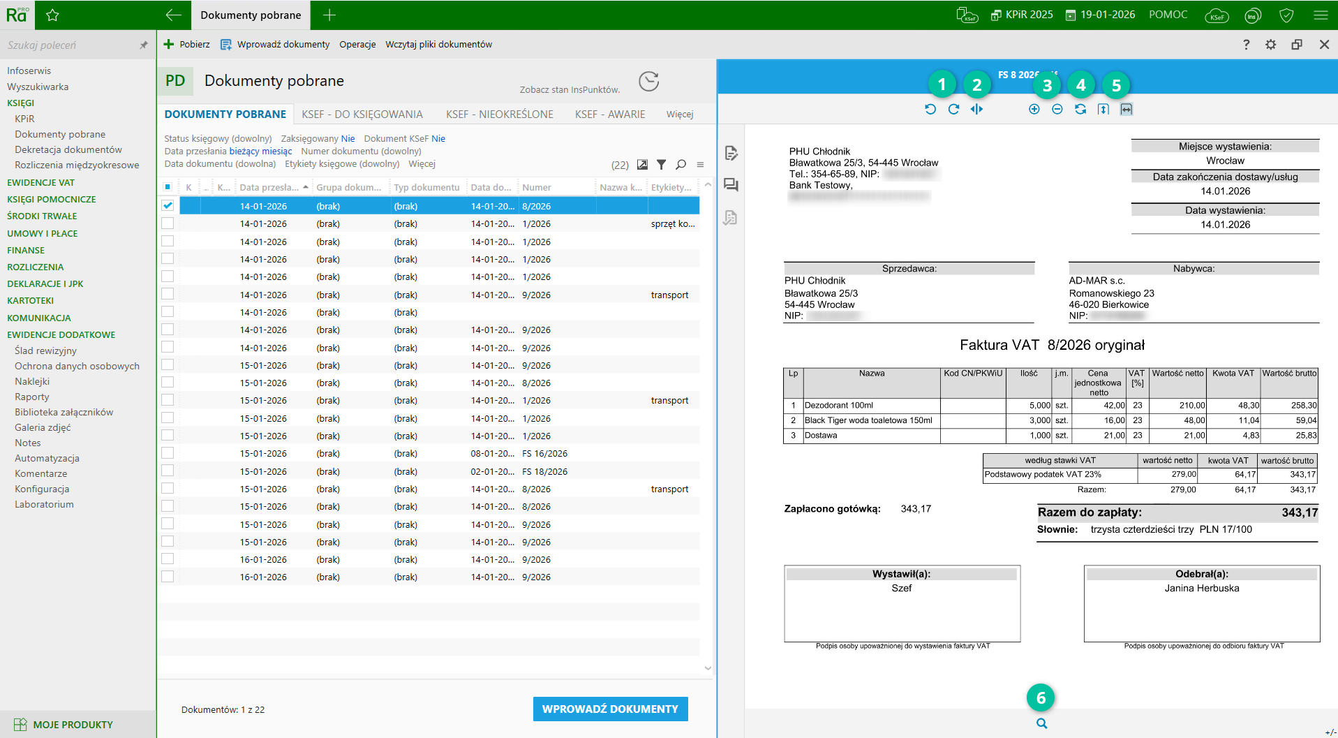 Gdy nowy dokument zostanie pobrany do programu księgowego, zobaczysz go na liście. Zaznacz odebraną fakturę, a po prawej stronie okna wyświetlony zostanie jej podgląd.