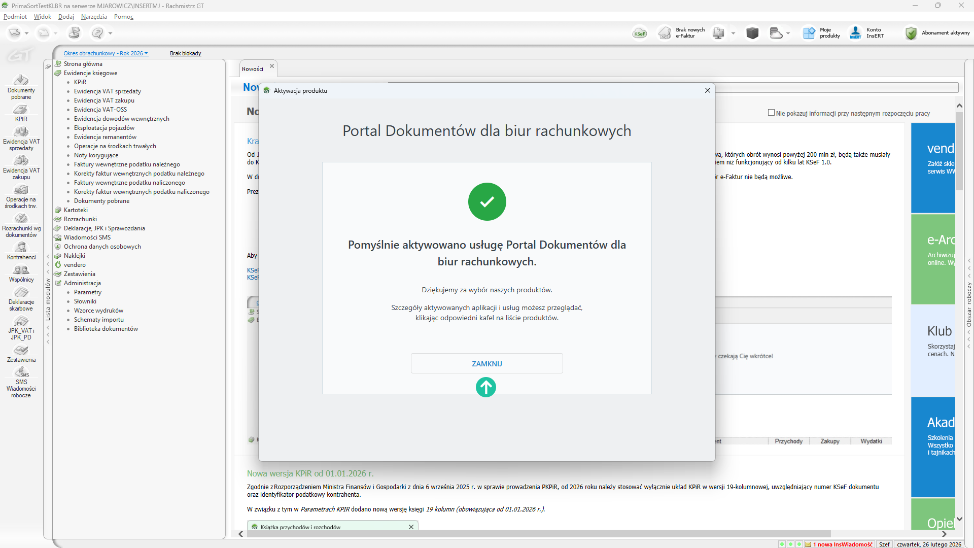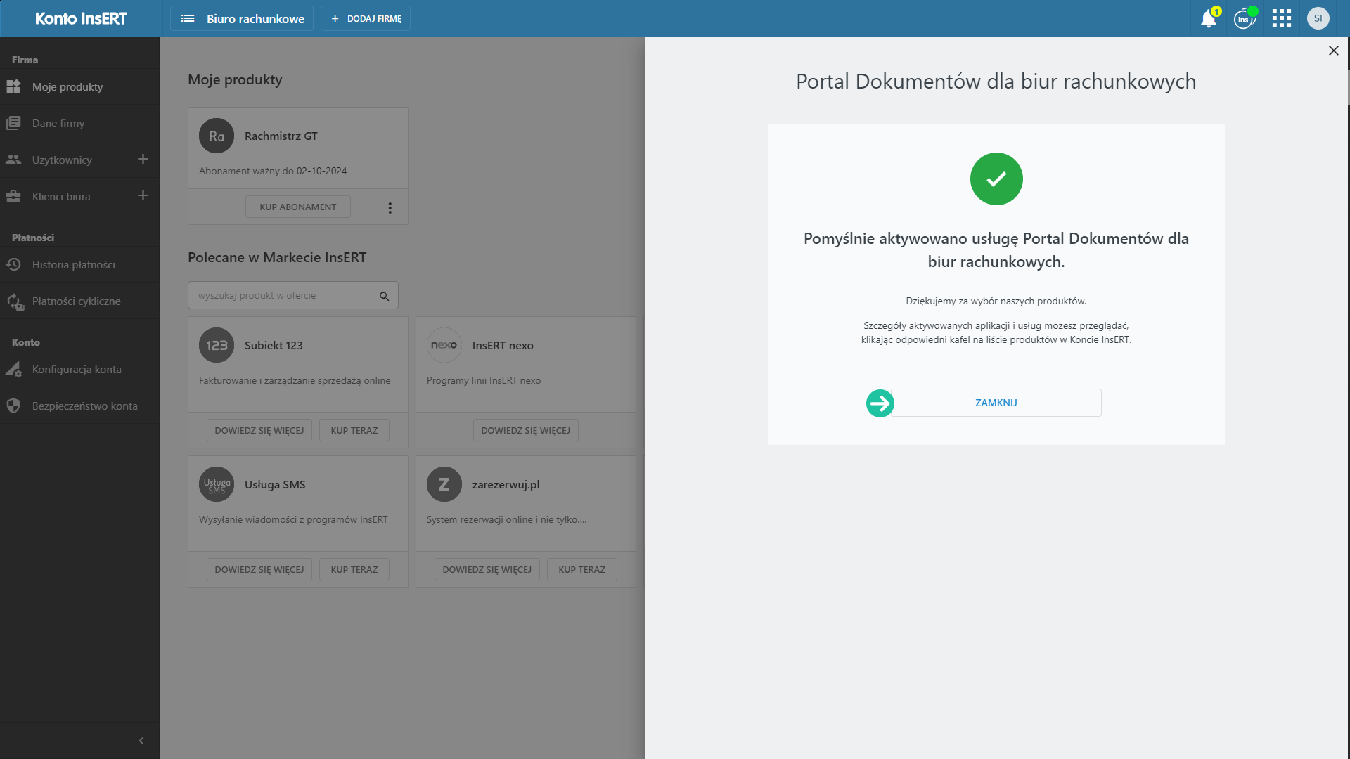 Na ekranie zobaczysz komunikat dotyczący pomyślnej aktywacji Portalu Dokumentów dla biur rachunkowych. Kliknij w przycisk ZAMKNIJ.