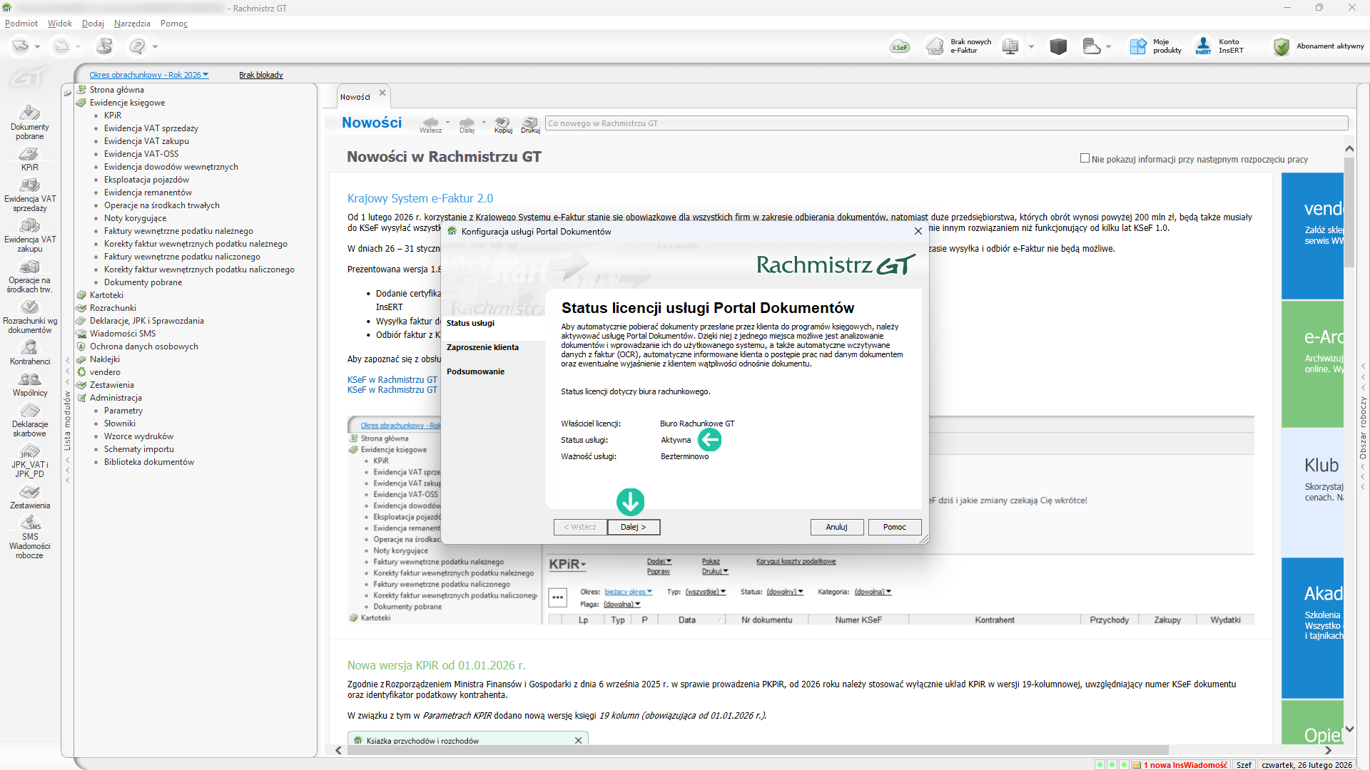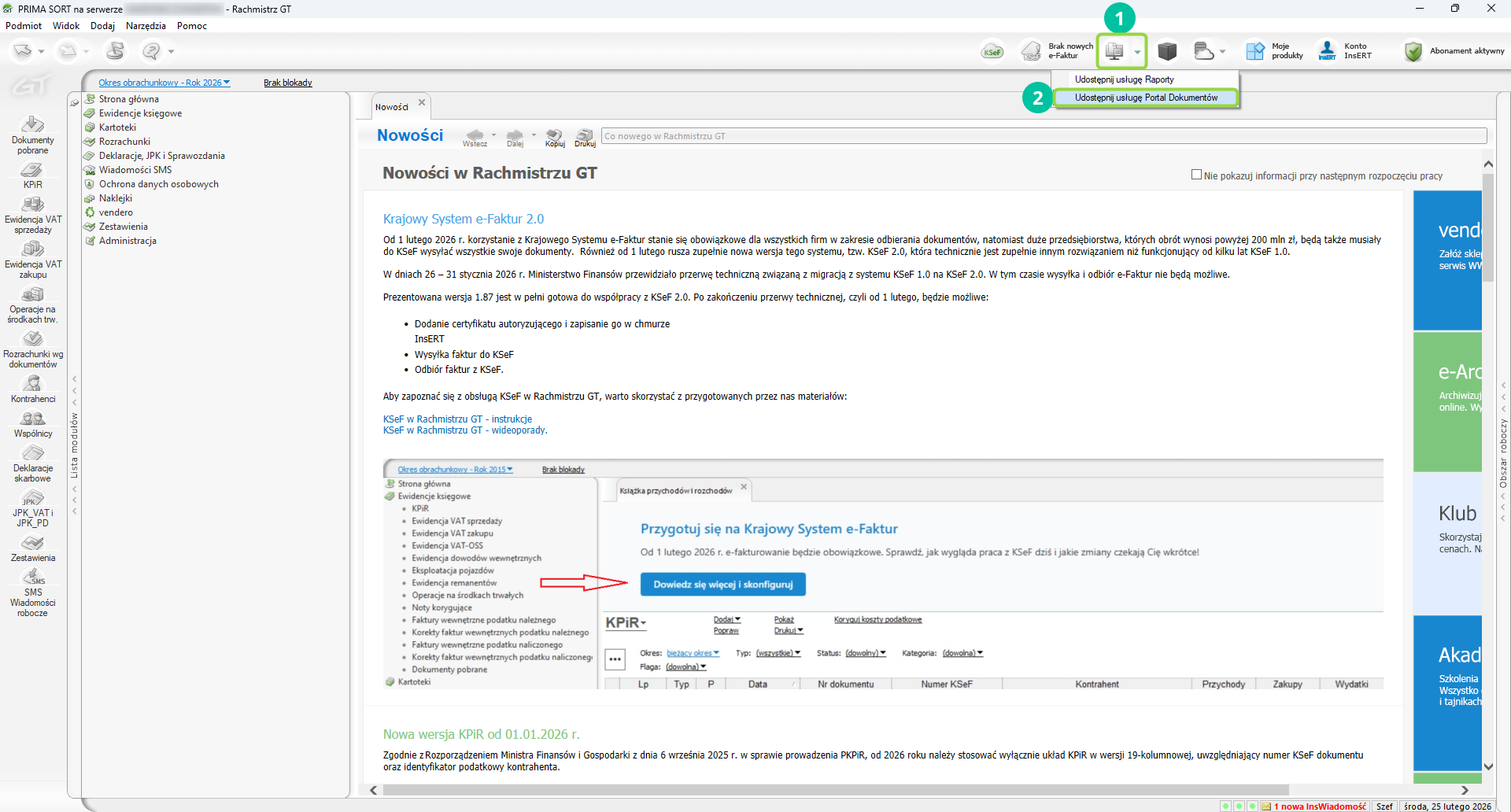 Kliknij w Portal Dokumentów (ikona monitora), znajdującą się w górnej części okna programu (pasek narzędzi). Następnie wybierz Aktywuj usługę Portal Dokumentów.