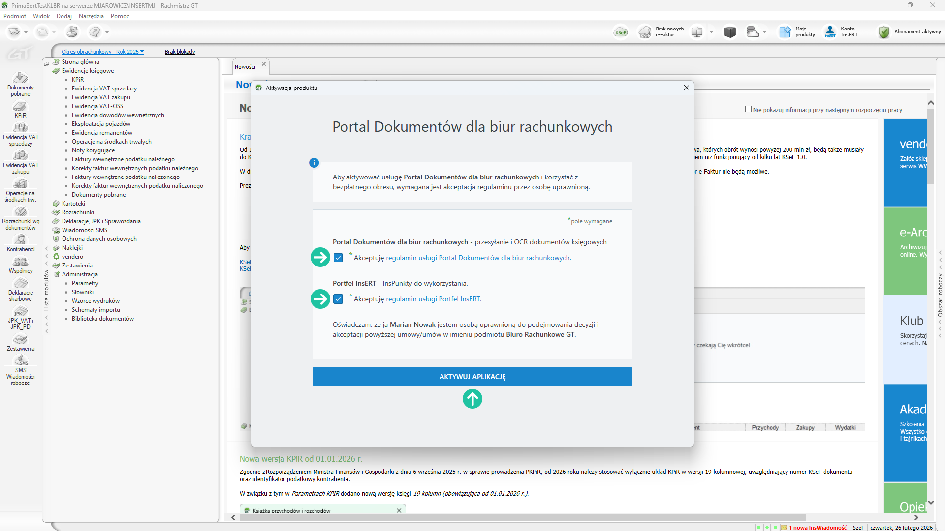 W oknie Aktywacja produktu zaakceptuj regulaminy usług Portal Dokumentów dla biur rachunkowych oraz Portfela InsERT. Kolejno kliknij przycisk AKTYWUJ.