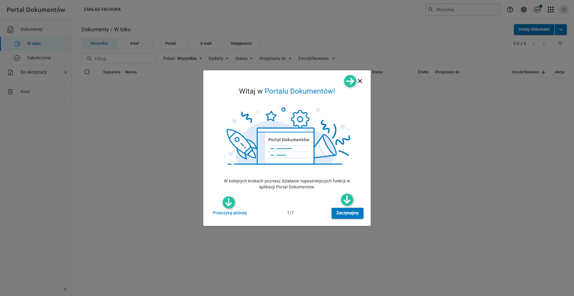 Podczas pierwszego uruchomienia Portalu Dokumentów wyświetlany jest tzw. samouczek, który prezentuje możliwości aplikacji. Zapoznaj się z poszczególnymi krokami klikając w przycisk Zaczynajmy. Możesz też użyć przycisku Przeczytaj później lub po prostu wyłączyć ekran samouczka zamykając go ikoną w prawym górnym rogu okna.
