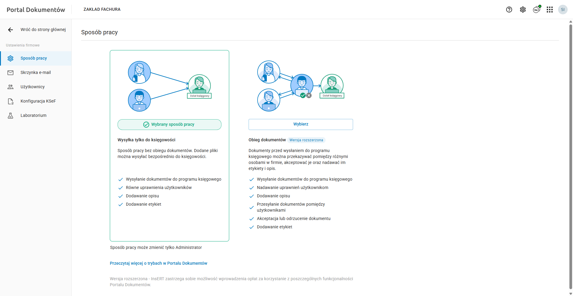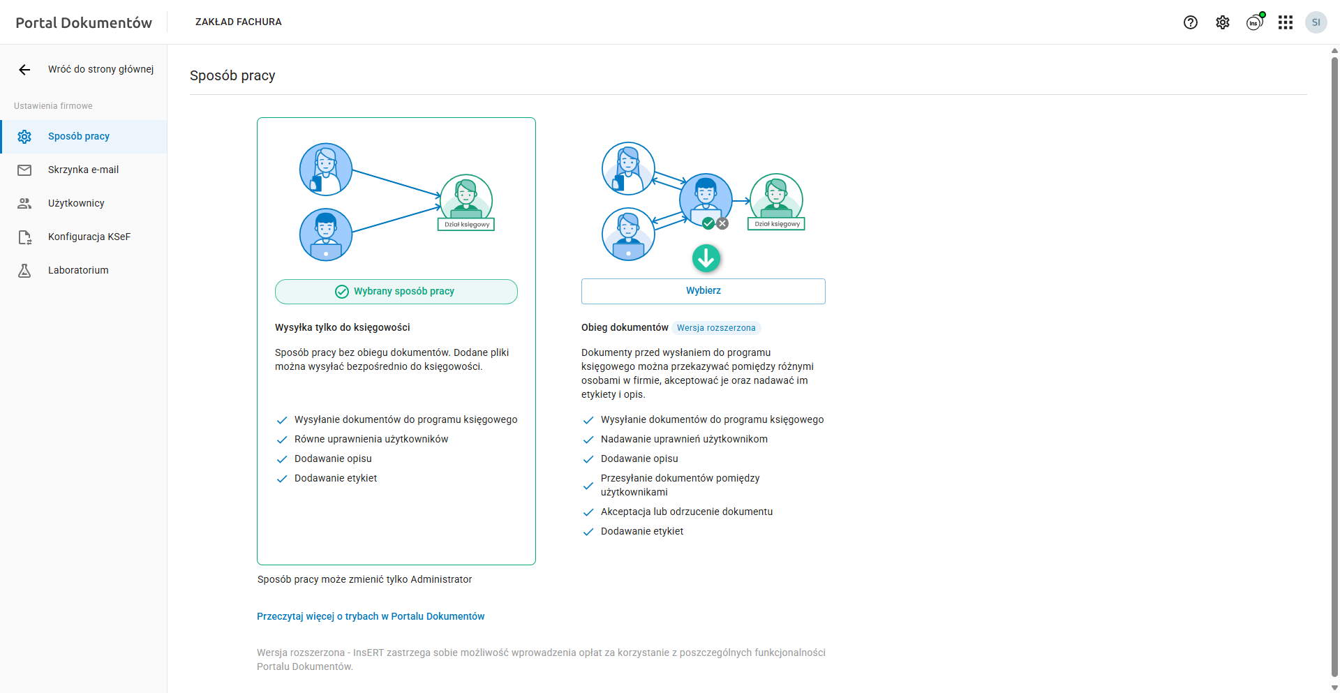 Tak jak już wspominano jest to domyślny sposób pracy ustawiony automatycznie po aktywowaniu Portalu Dokumentów. Zmianę sposobu pracy umożliwia przycisk Wybierz.