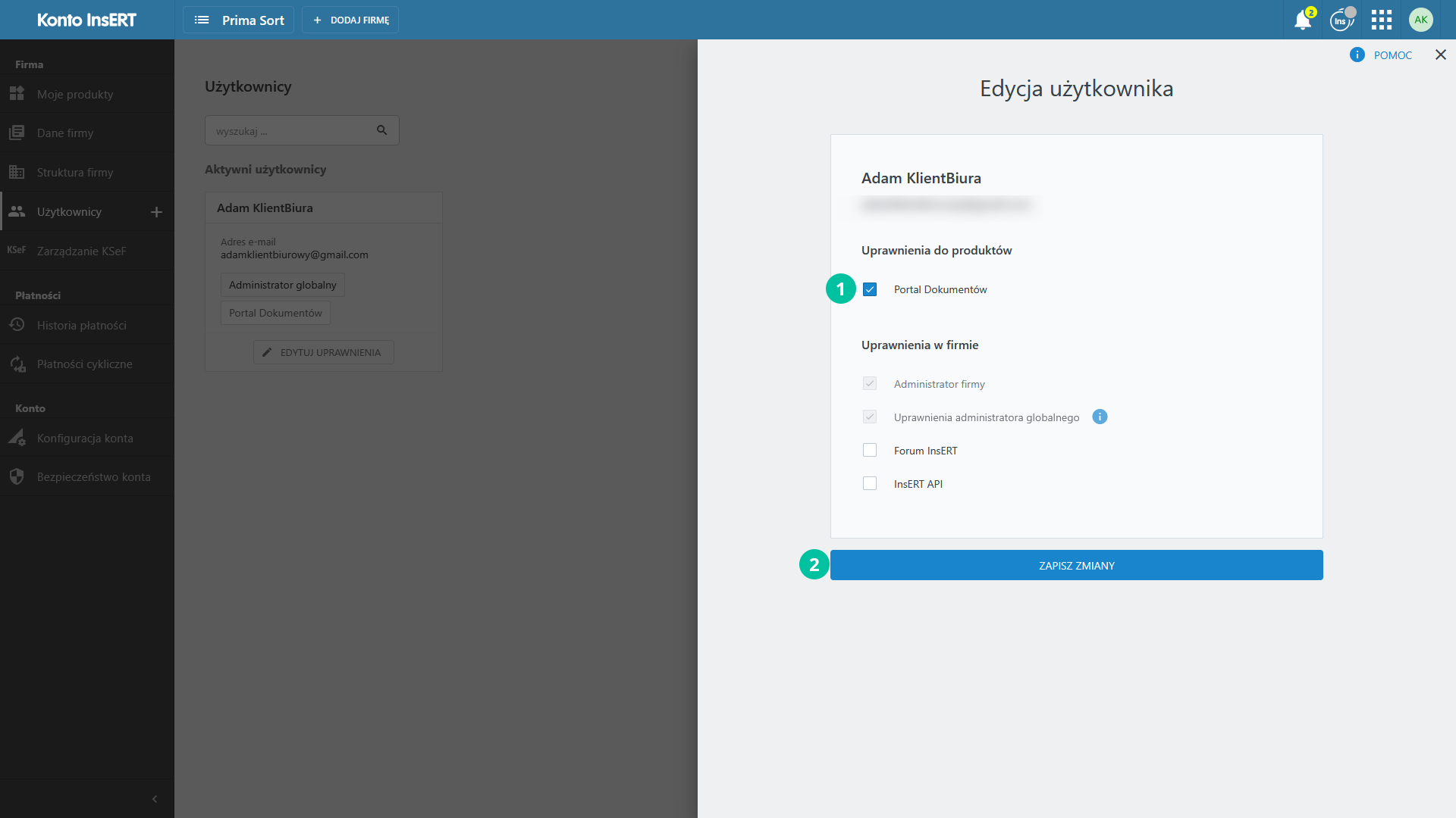 Jeżeli dany użytkownik ma posiadać uprawnienia do Portalu Dokumentów, zadbaj o to aby w jego sekcji Uprawnienia do produktów zaznaczone było pole przy pozycji Portal Dokumentów. Po każdej zmianie zaznaczenia, kliknij w przycisk Zapisz zmiany.
