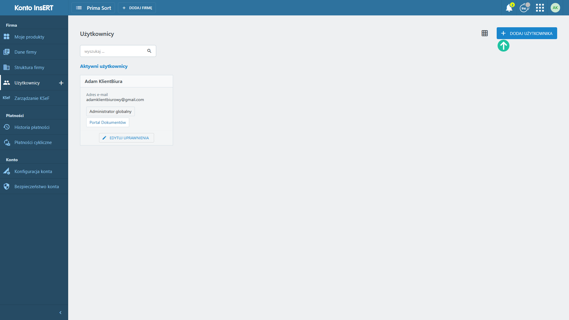 Jeśli chcesz dodać nowego użytkownika do obsługi Portalu Dokumentów, musisz najpierw dodać go w serwisie Konto InsERT. Kliknij w tym celu w przycisk Dodaj użytkownika.