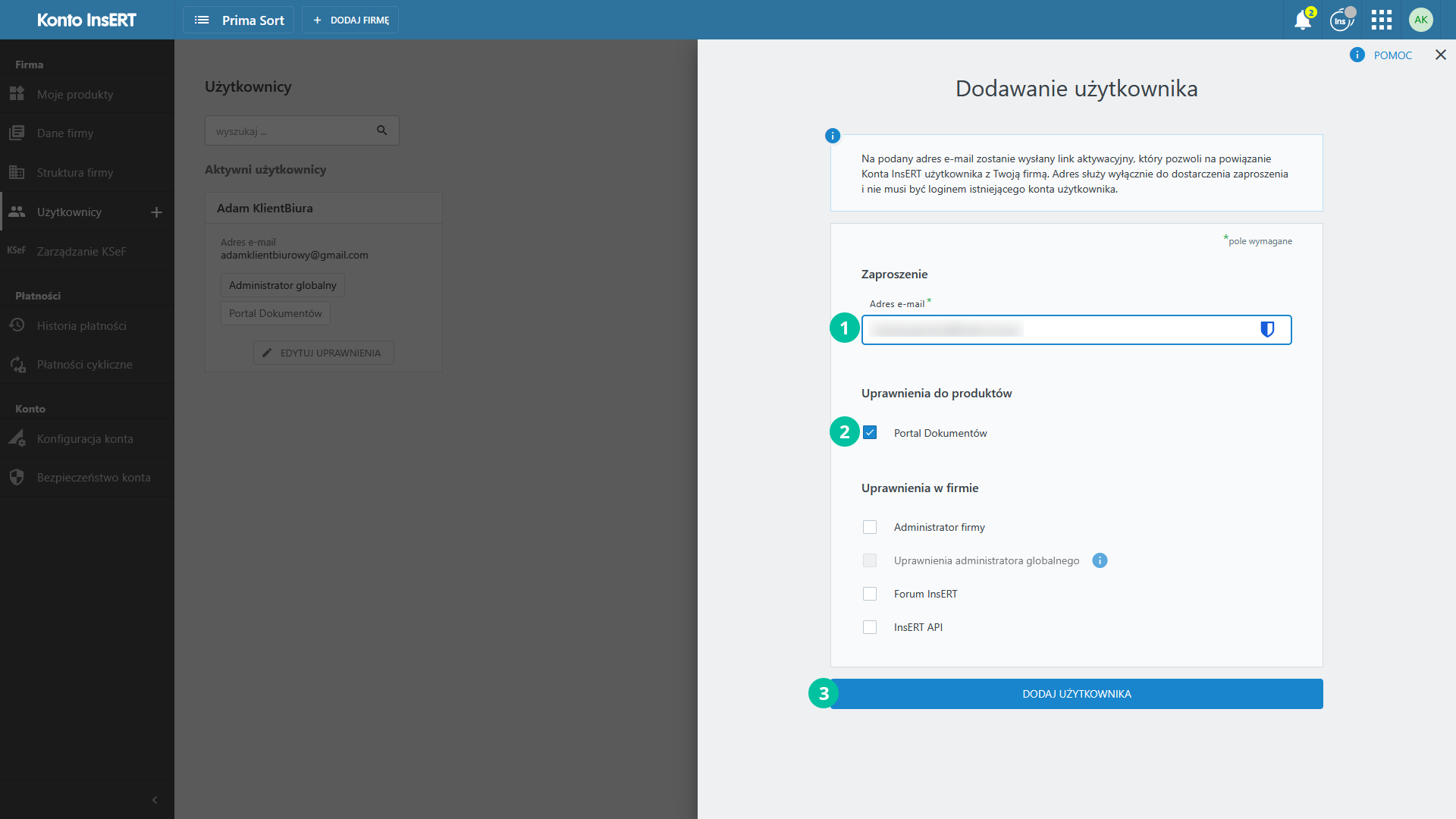 W oknie dodawania użytkownika wprowadź adres e-mail osoby, do której zostanie wysłane zaproszenie do usługi, a następnie zaznacz uprawnienie do Portalu Dokumentów i kliknij w przycisk Dodaj użytkownika.