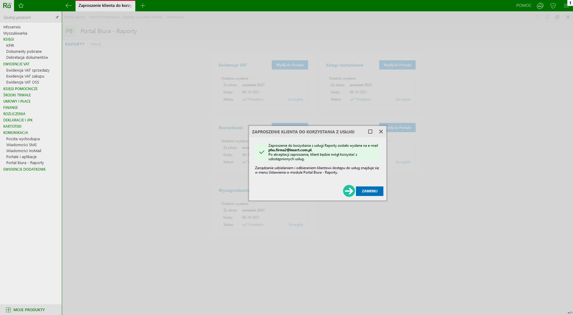 Gotowe! Zaproszenie do korzystania z usługi Raporty InsERT nexo zostało wysłane na podany adres. Gdy Twój klient zaakceptuje zaproszenie, będziesz mógł udostępniać mu zestawienia i informacje finansowo-księgowe za pośrednictwem Portalu.